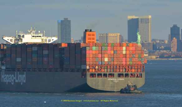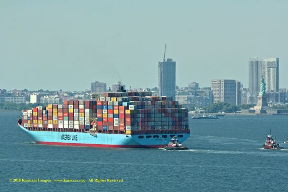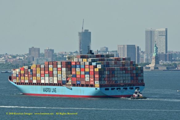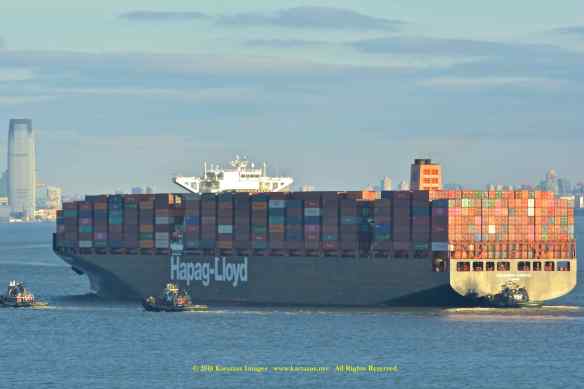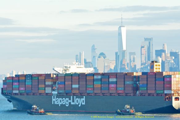 Images of neo-panamax containership MV ‘GSL Tianjin’ entering the New York Harbor; detail of the Moran harbor tugs in attendance. Image credit: Karatzas Images