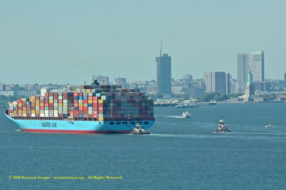 Images of neo-panamax containership MV ‘GSL Tianjin’ entering the New York Harbor; seen here against the Statue of Liberty. Image credit: Karatzas Images