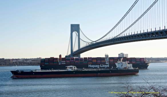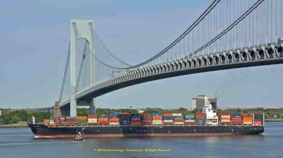 Images of neo-panamax containership MV ‘GSL Tianjin’ entering the New York Harbor; seen here under the Verrazzano-Narrows Bridge. Image credit: Karatzas Images