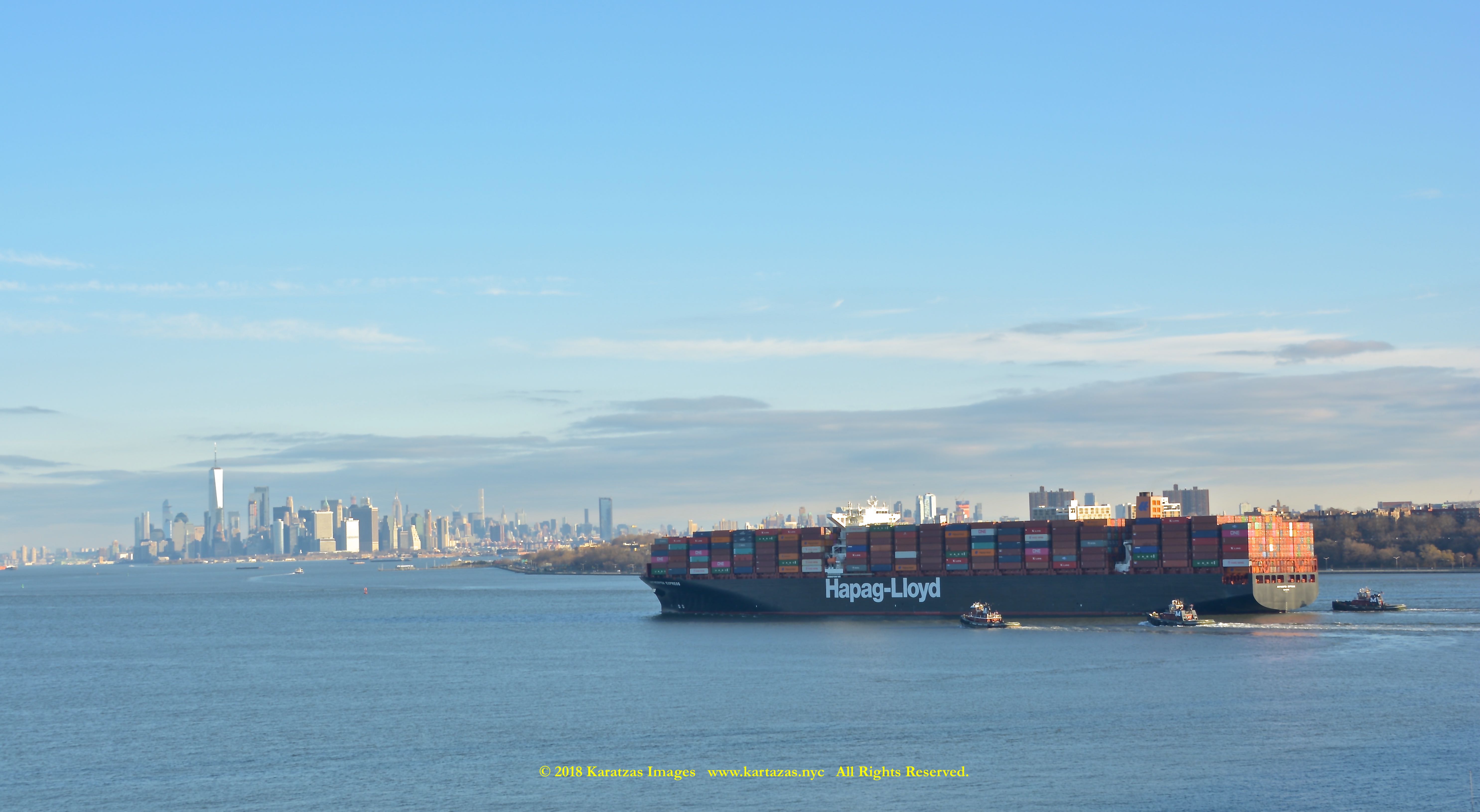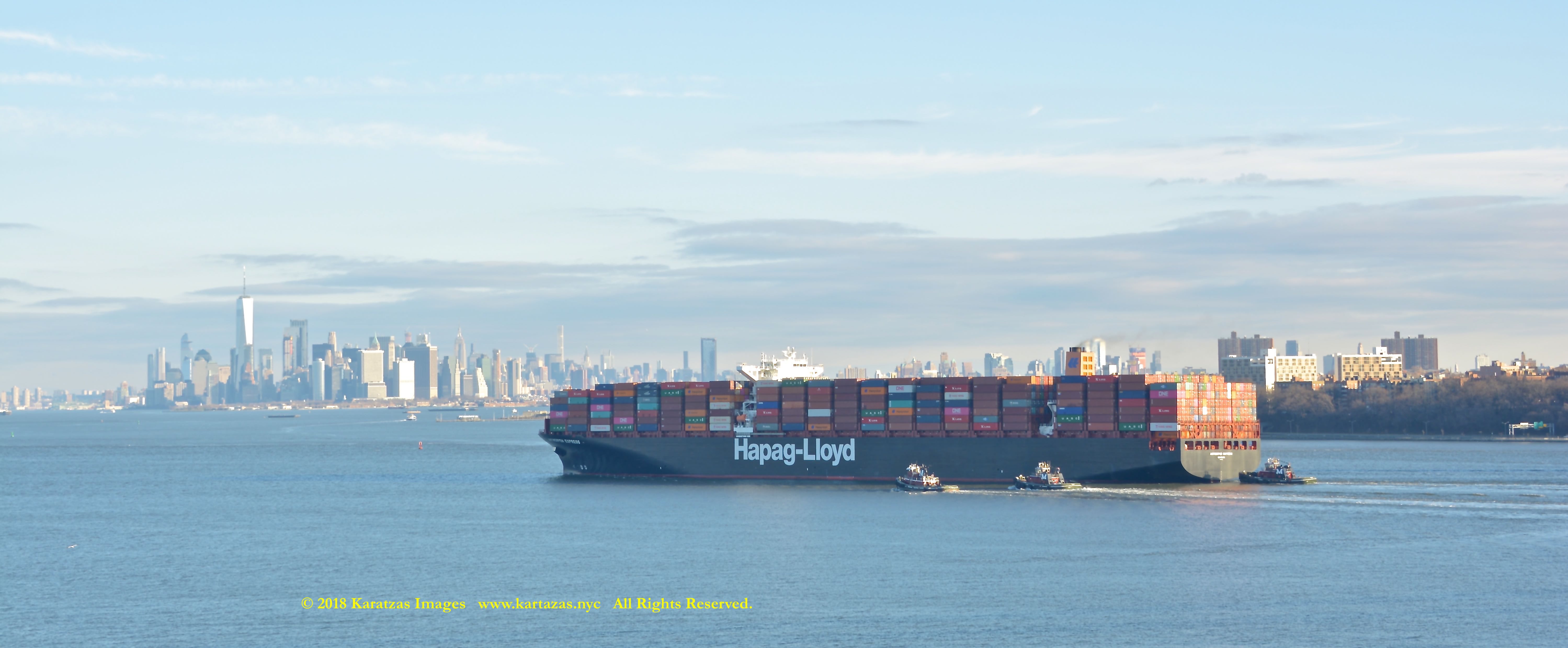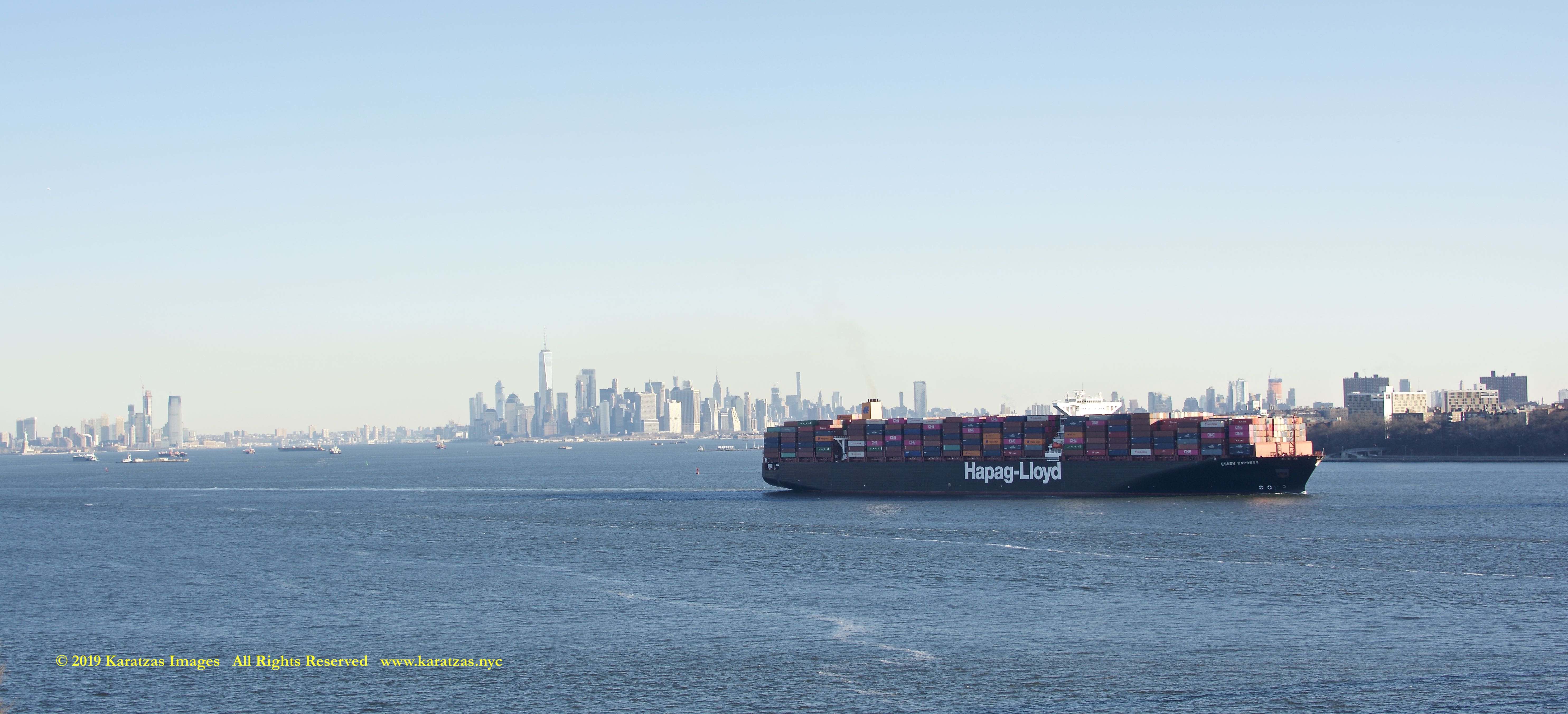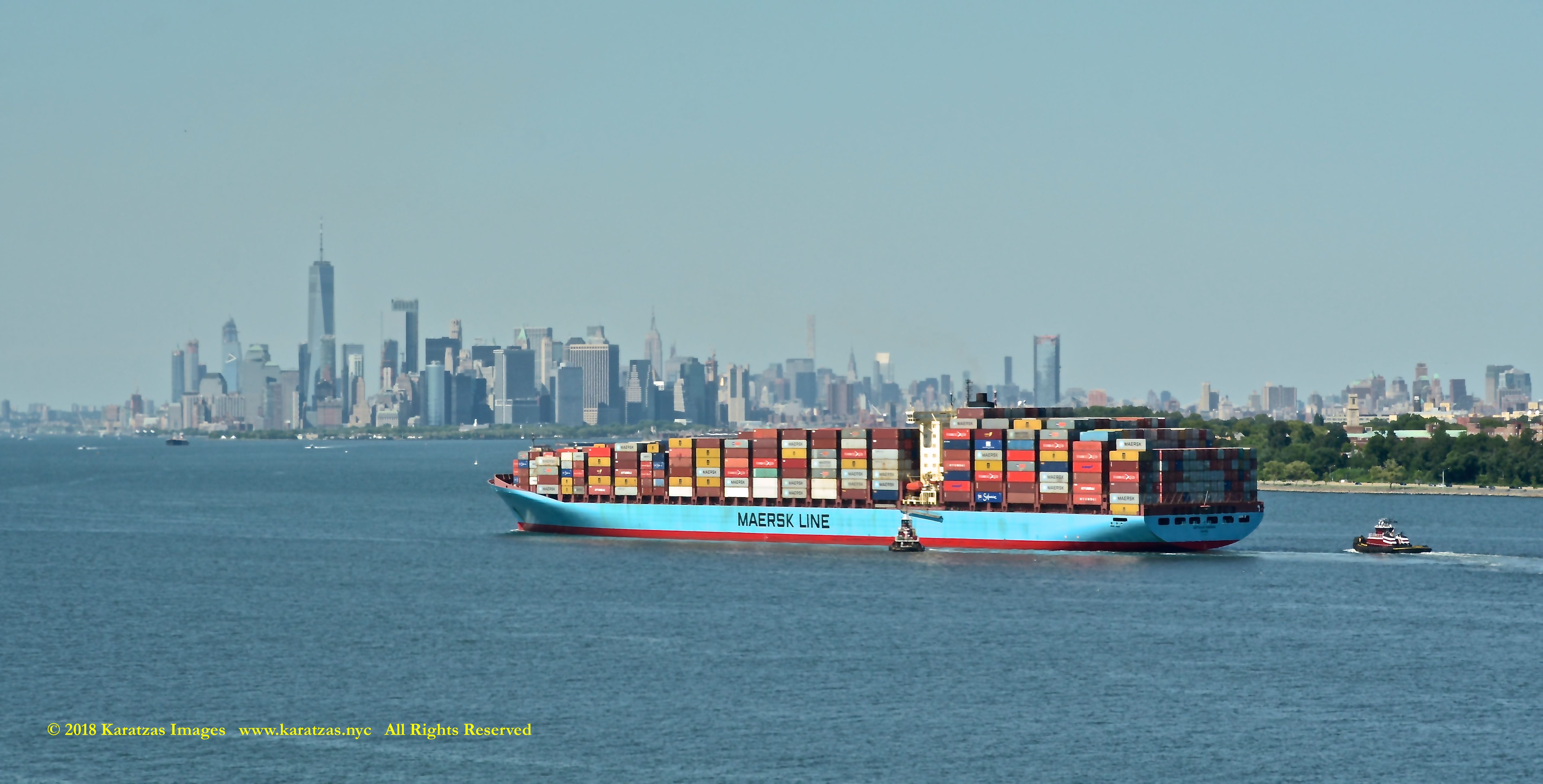 Images of neo-panamax containership MV ‘GSL Tianjin’ entering the New York Harbor; seen here against the Lower Manhattan skyline and the World Trade Center. Image credit: Karatzas Images