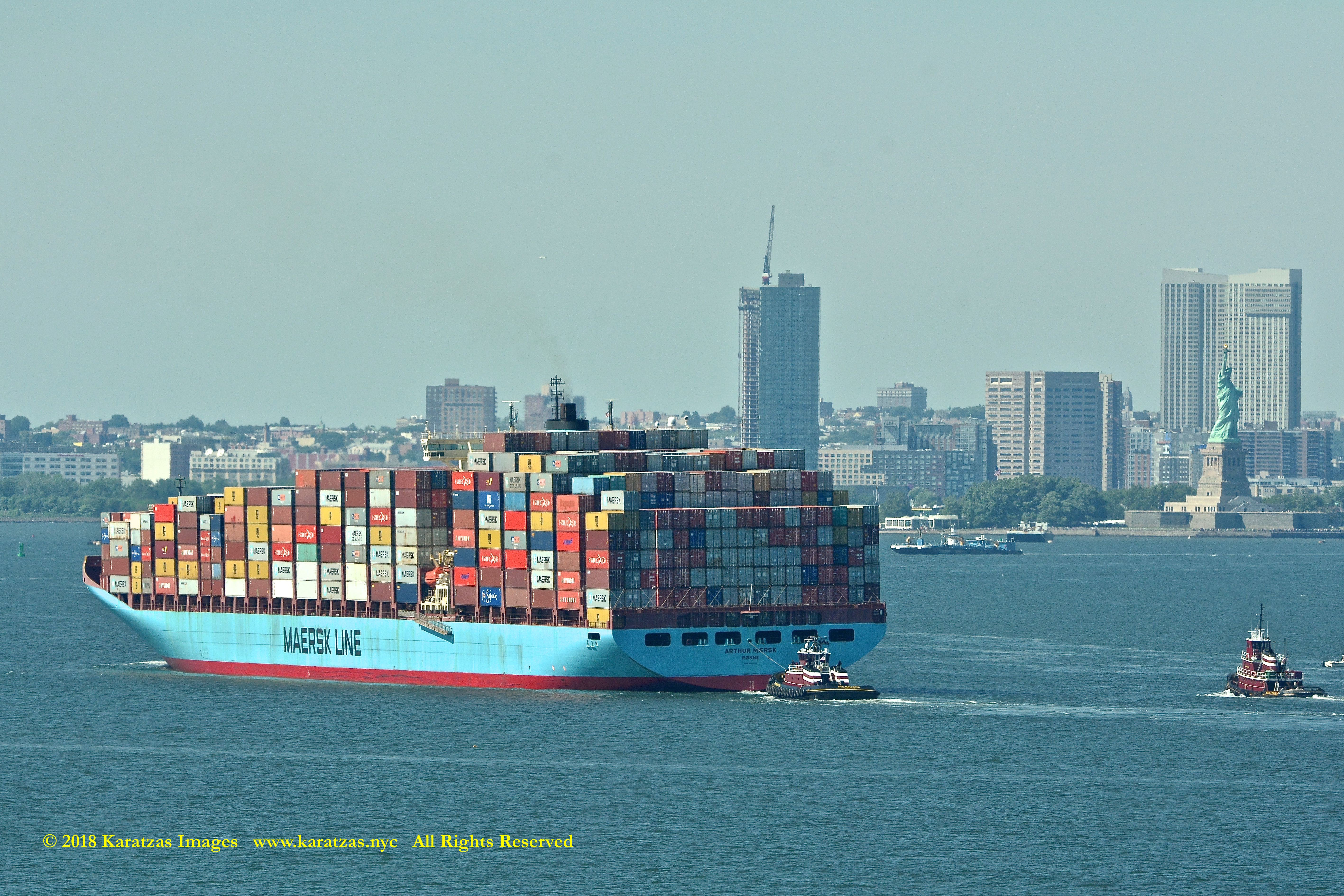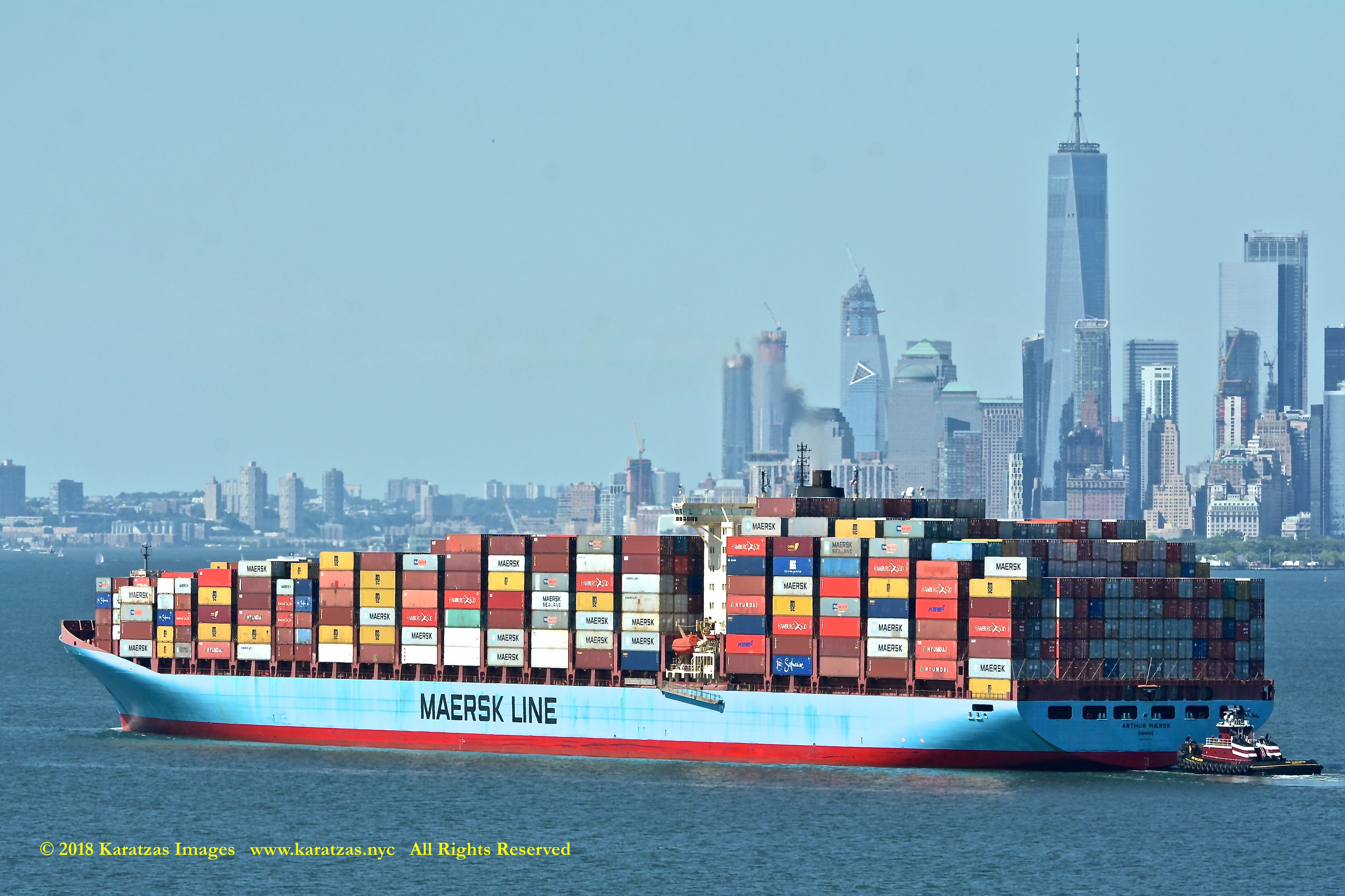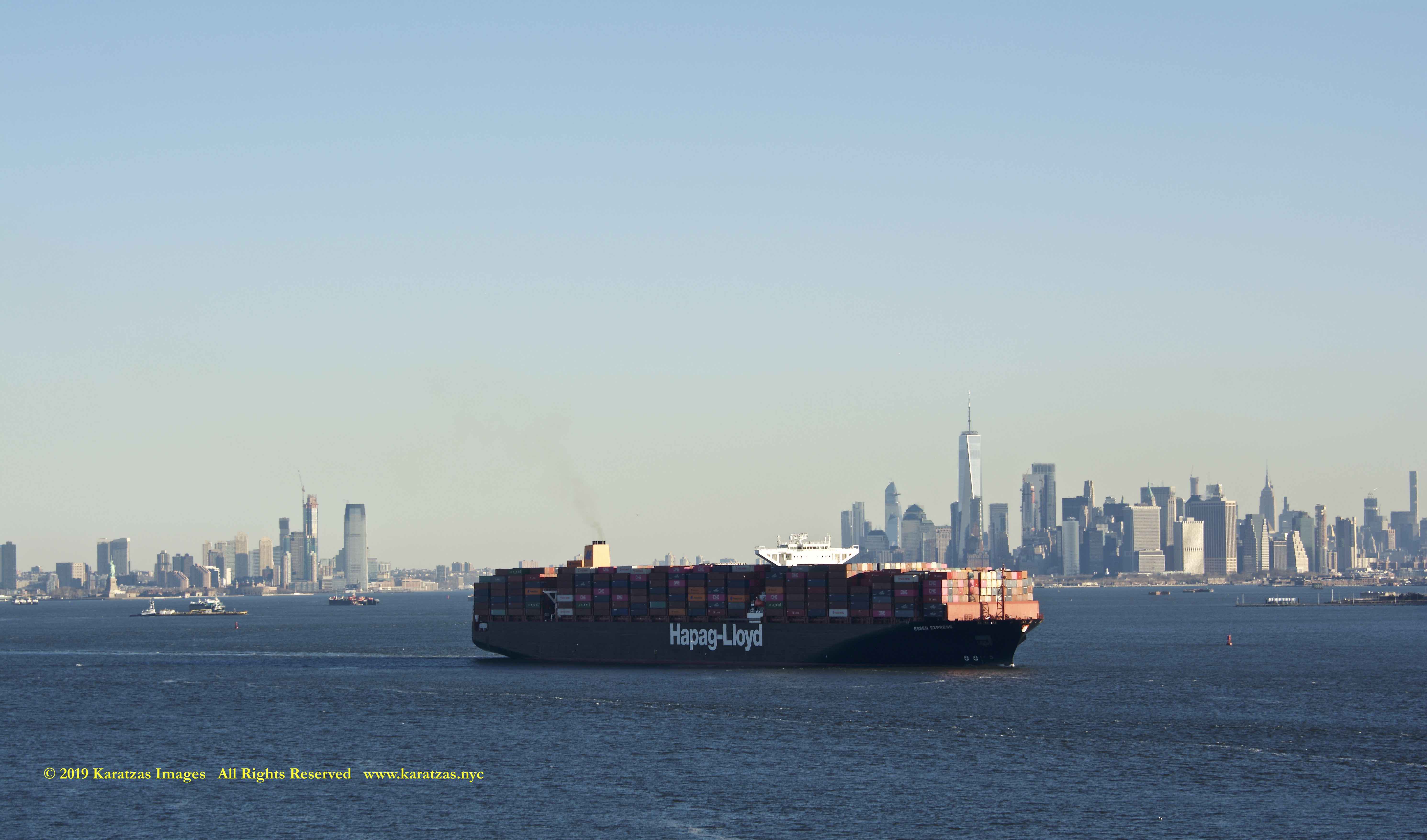 Images of neo-panamax containership MV ‘GSL Tianjin’ entering the New York Harbor; seen here against the Lower Manhattan skyline and the World Trade Center. Image credit: Karatzas Images