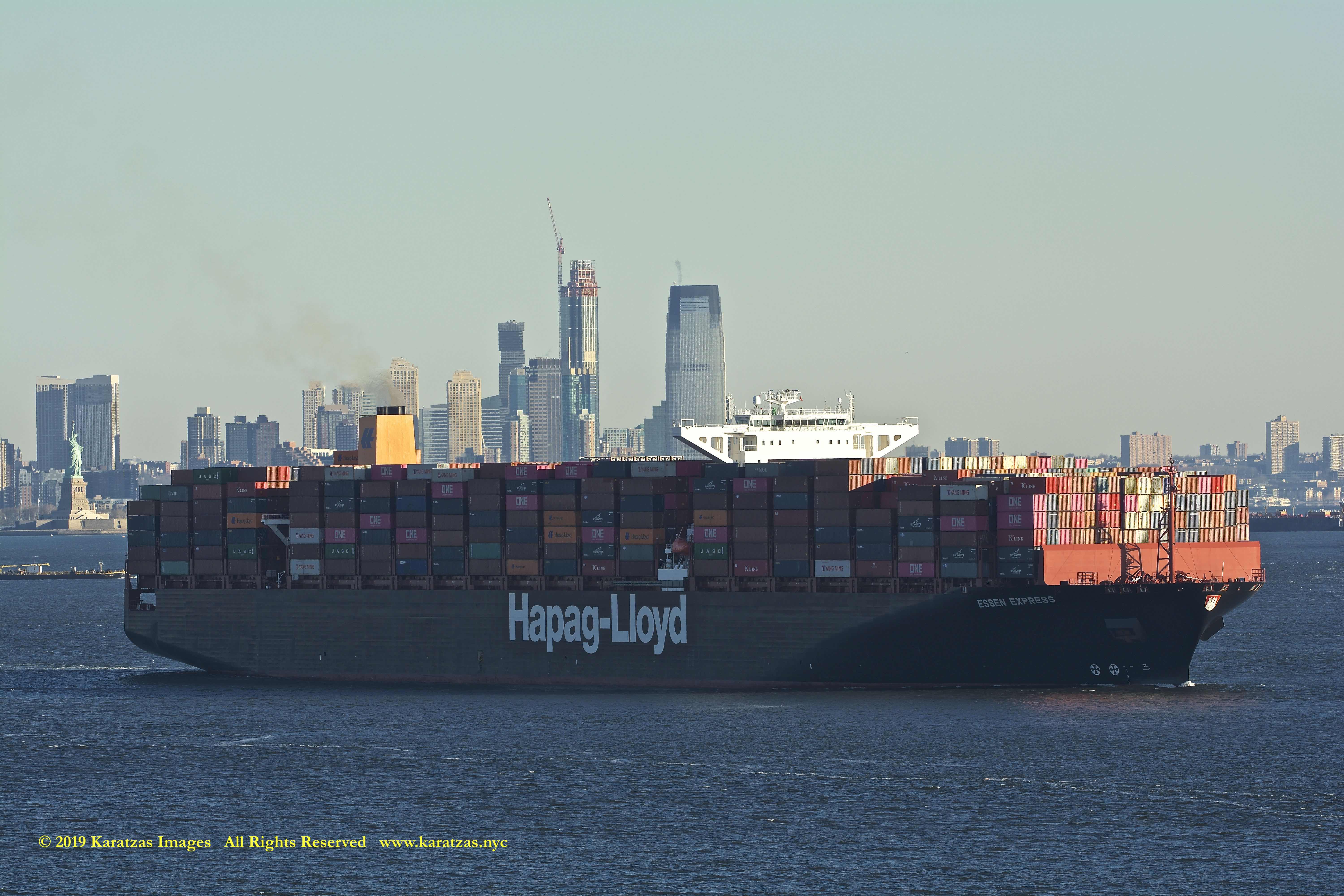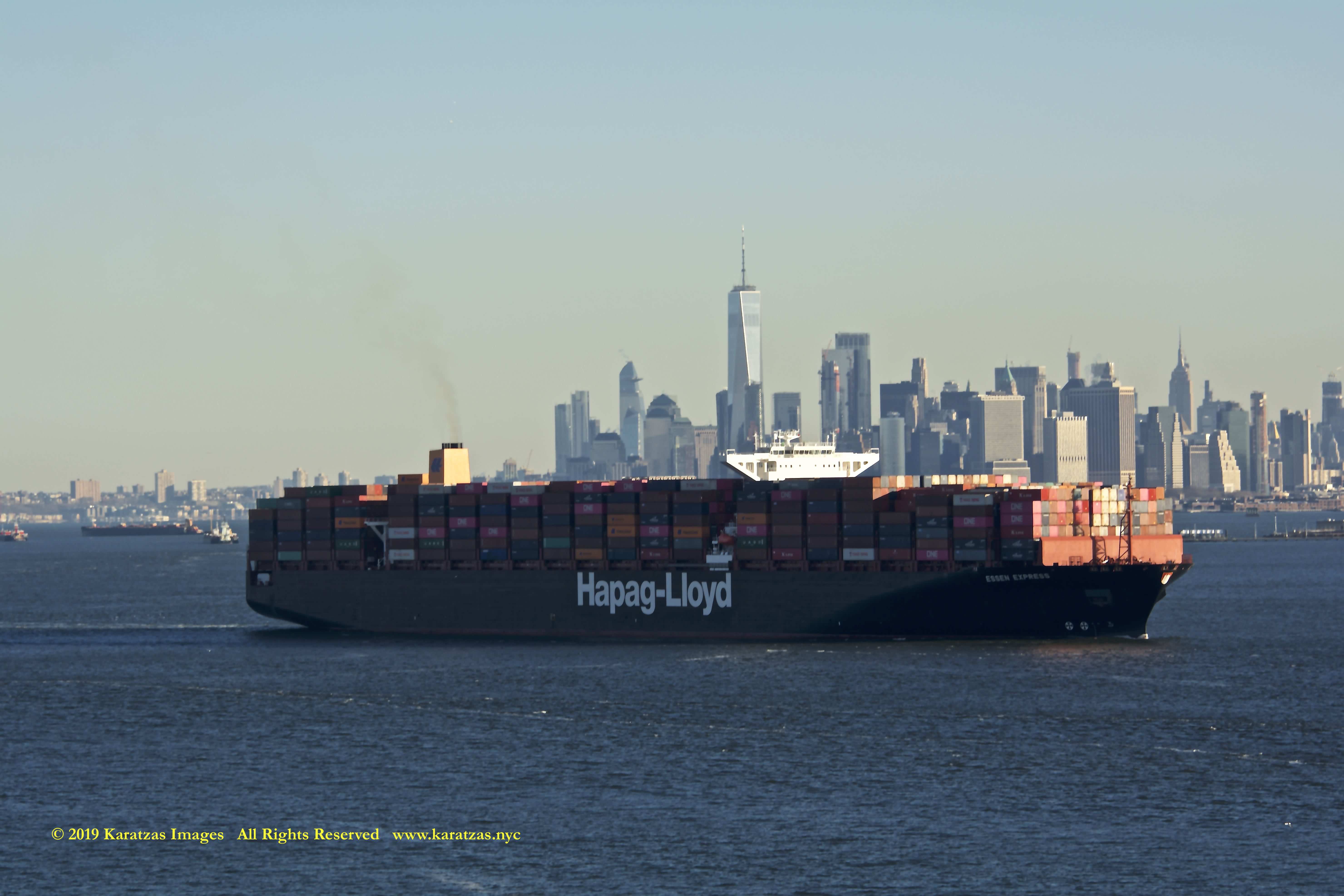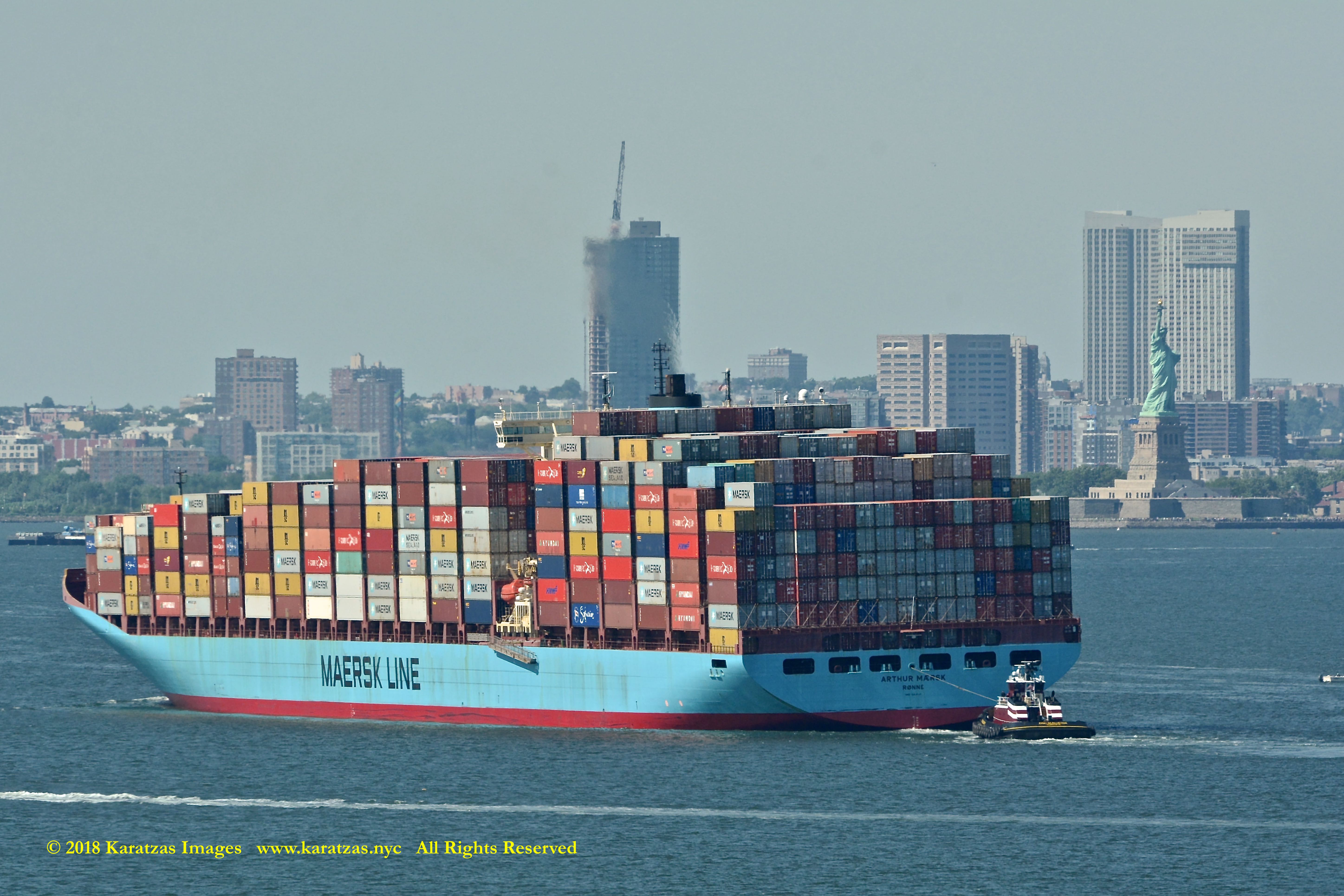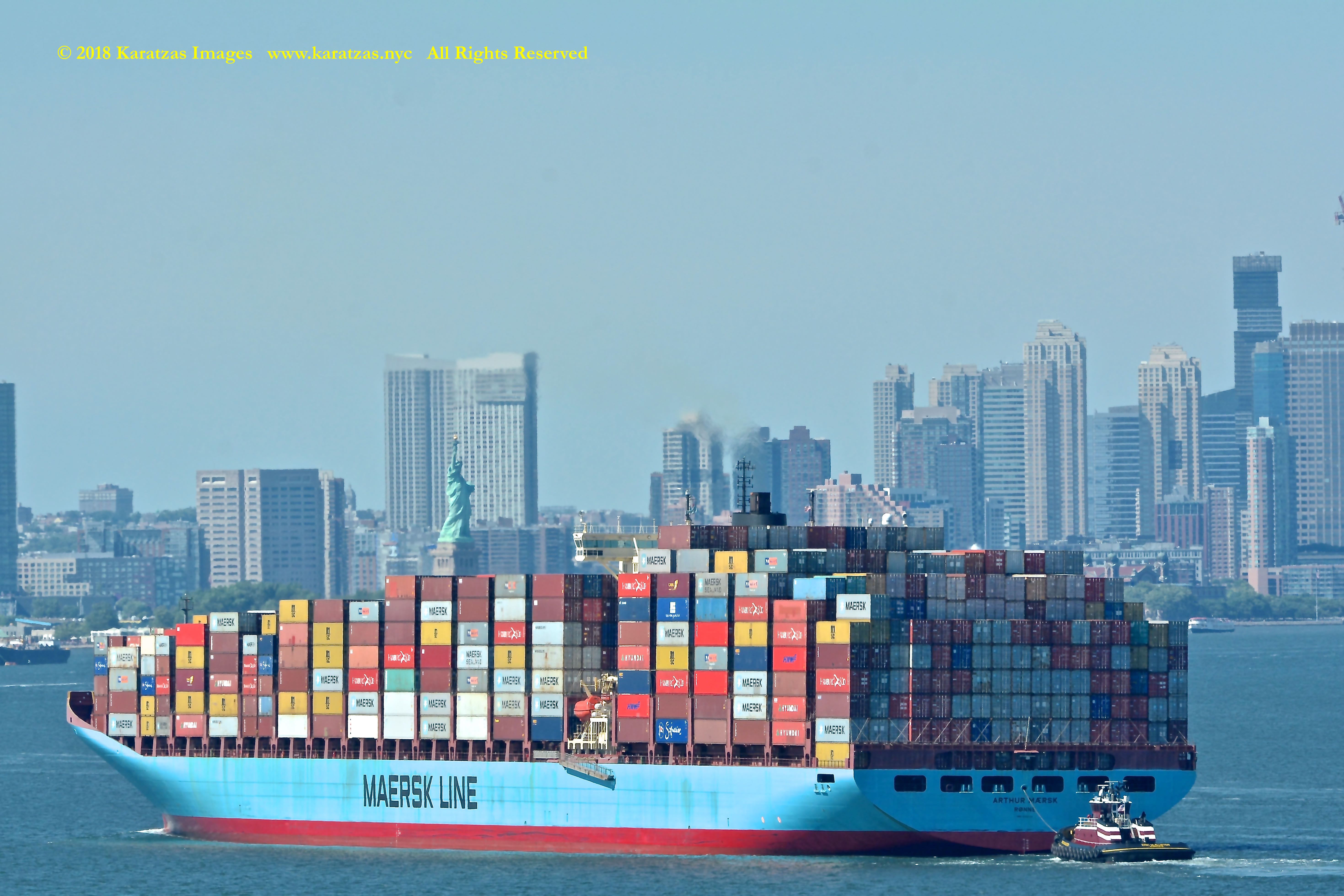 Images of neo-panamax containership MV ‘GSL Tianjin’ entering the New York Harbor; seen here against the Lower Manhattan skyline and the World Trade Center. Image credit: Karatzas Images