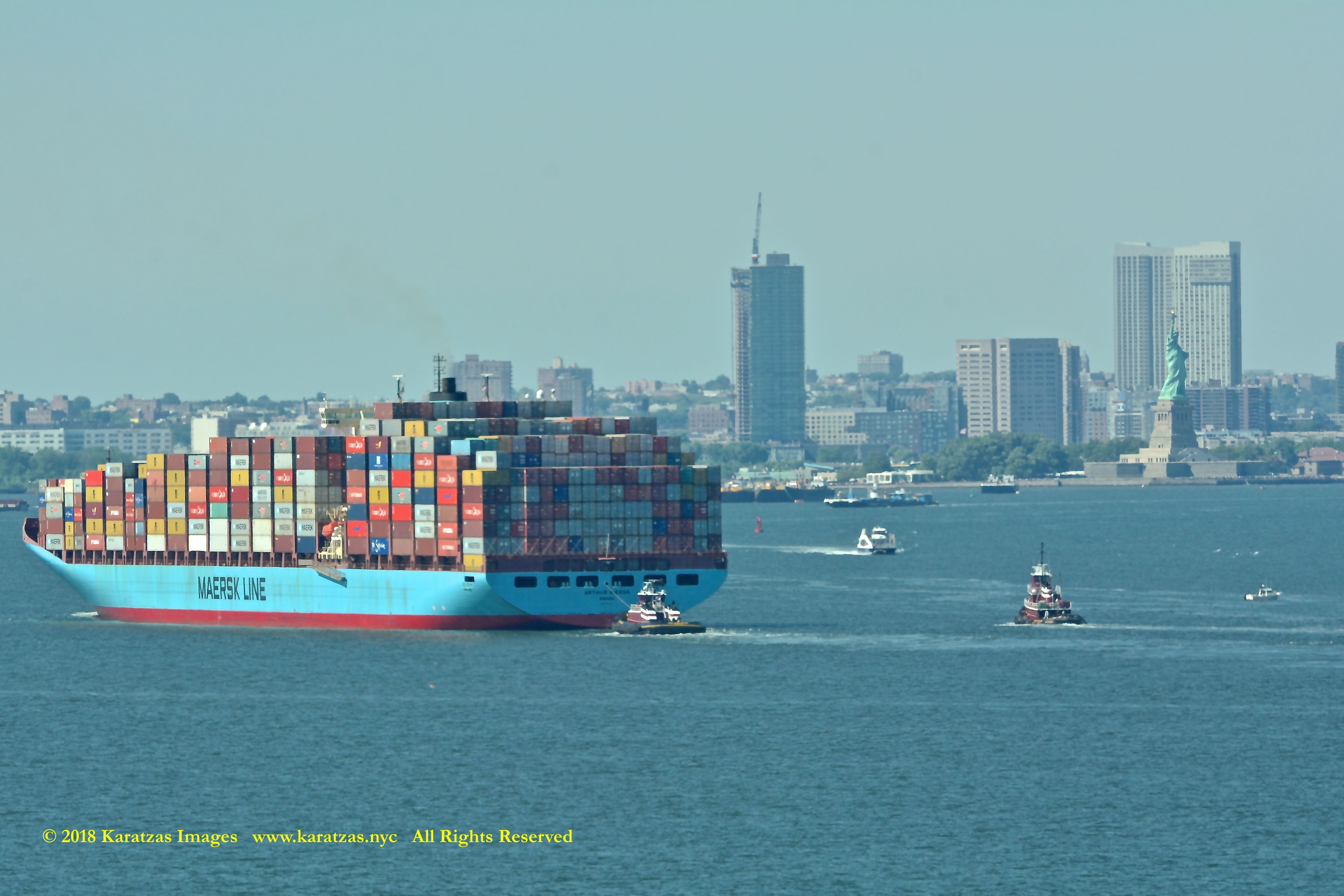 Images of neo-panamax containership MV ‘GSL Tianjin’ entering the New York Harbor; seen here against the Statue of Liberty. Image credit: Karatzas Images