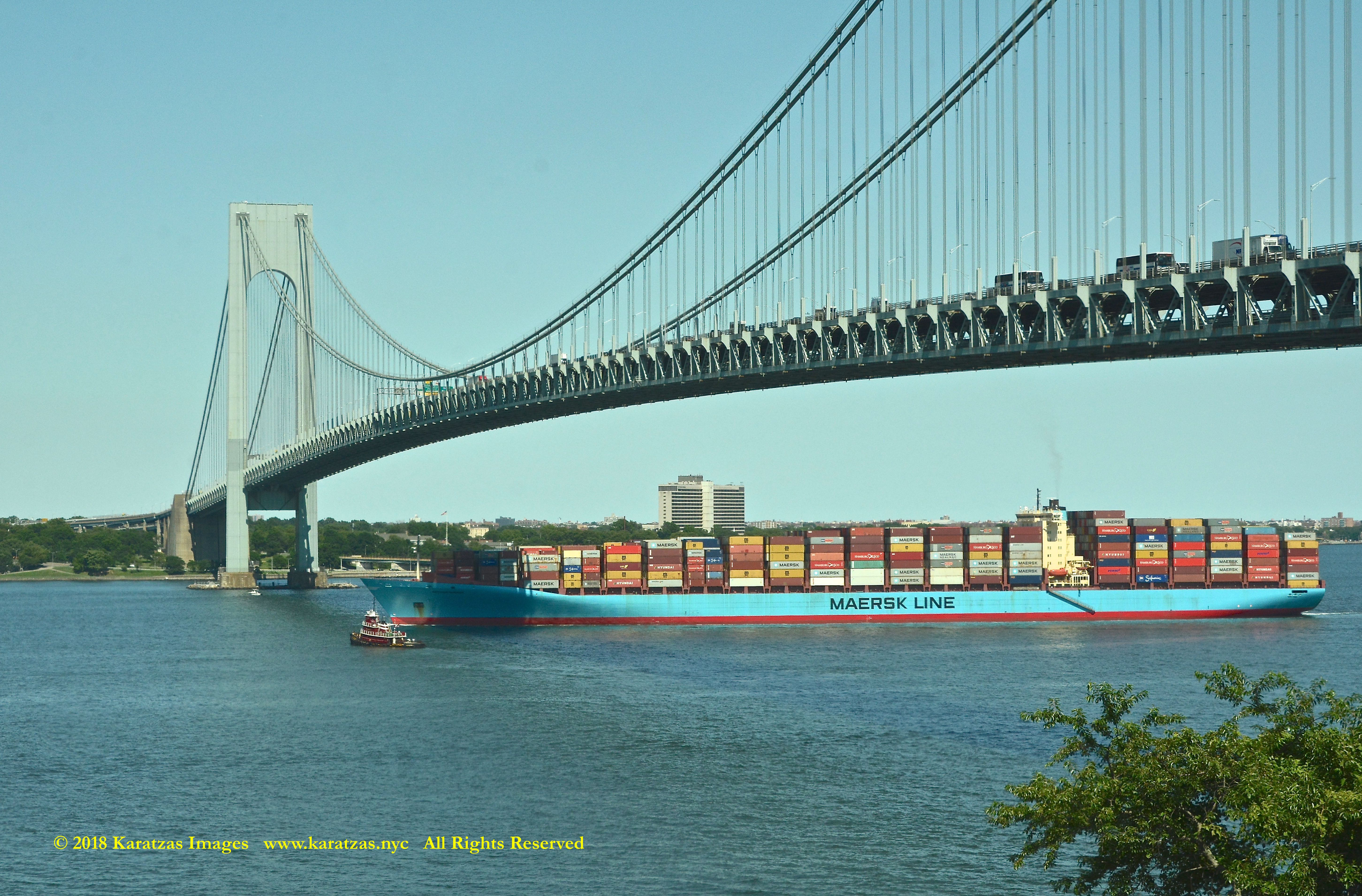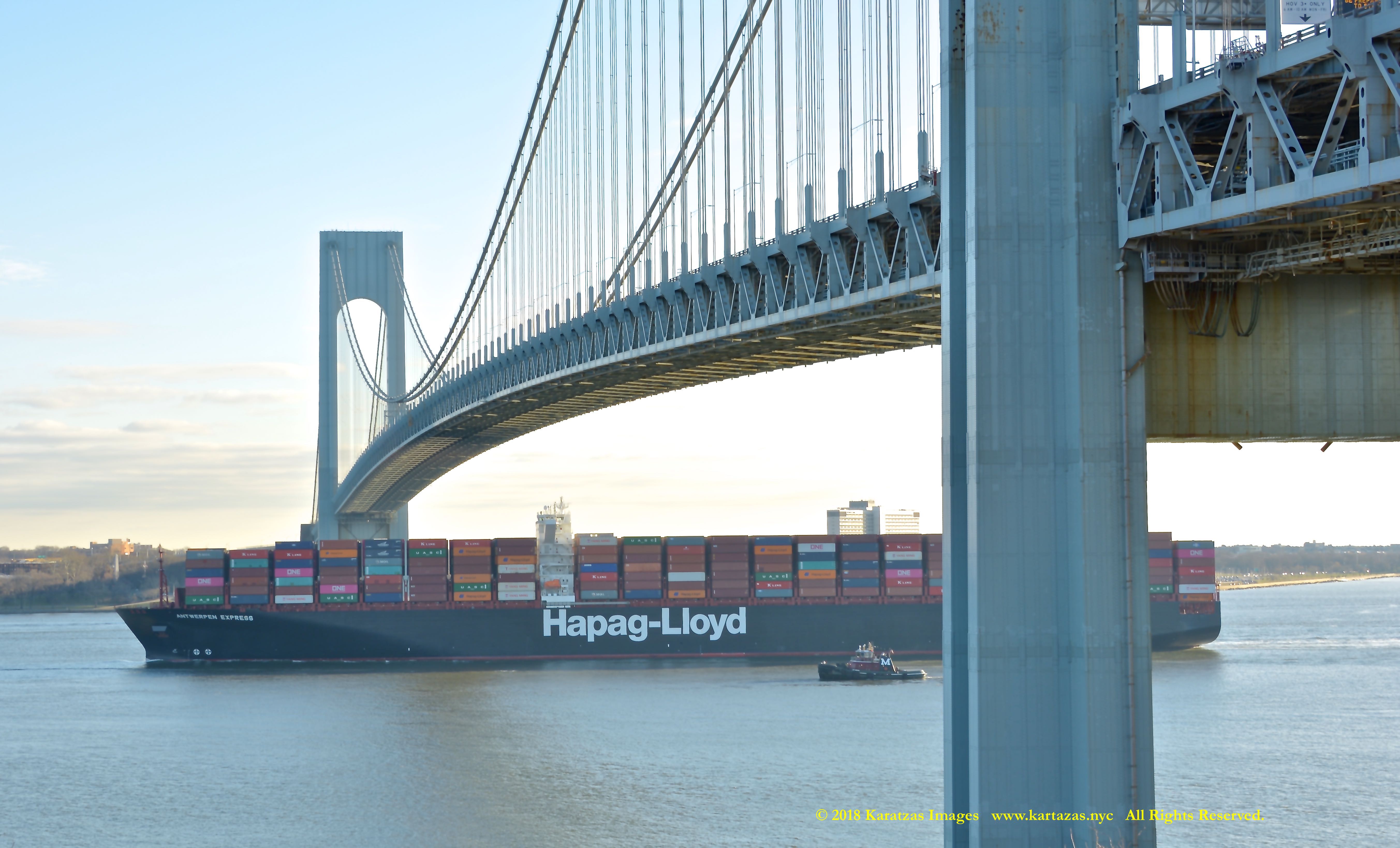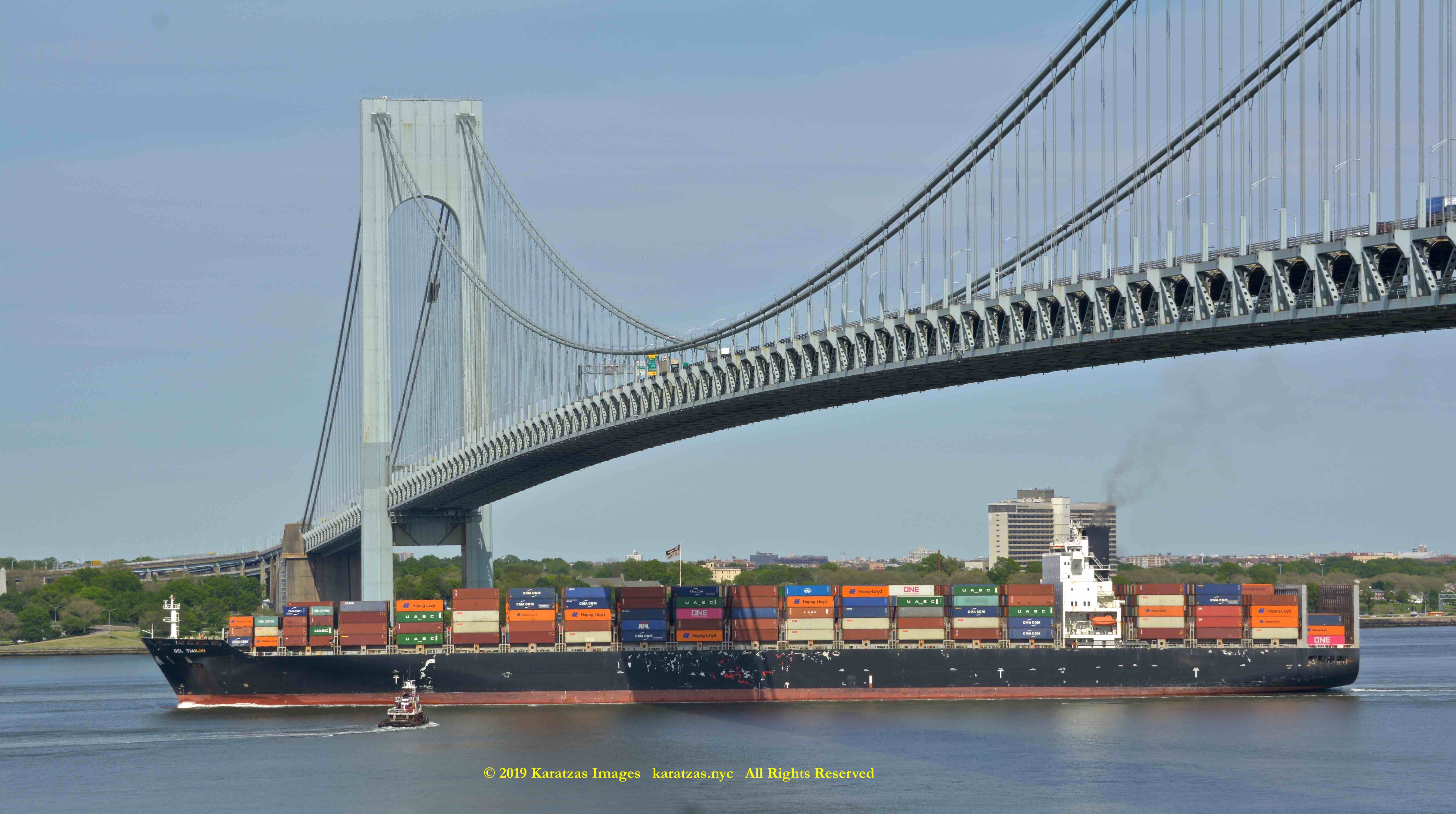 Images of neo-panamax containership MV ‘GSL Tianjin’ entering the New York Harbor; seen here under the Verrazzano-Narrows Bridge. Image credit: Karatzas Images