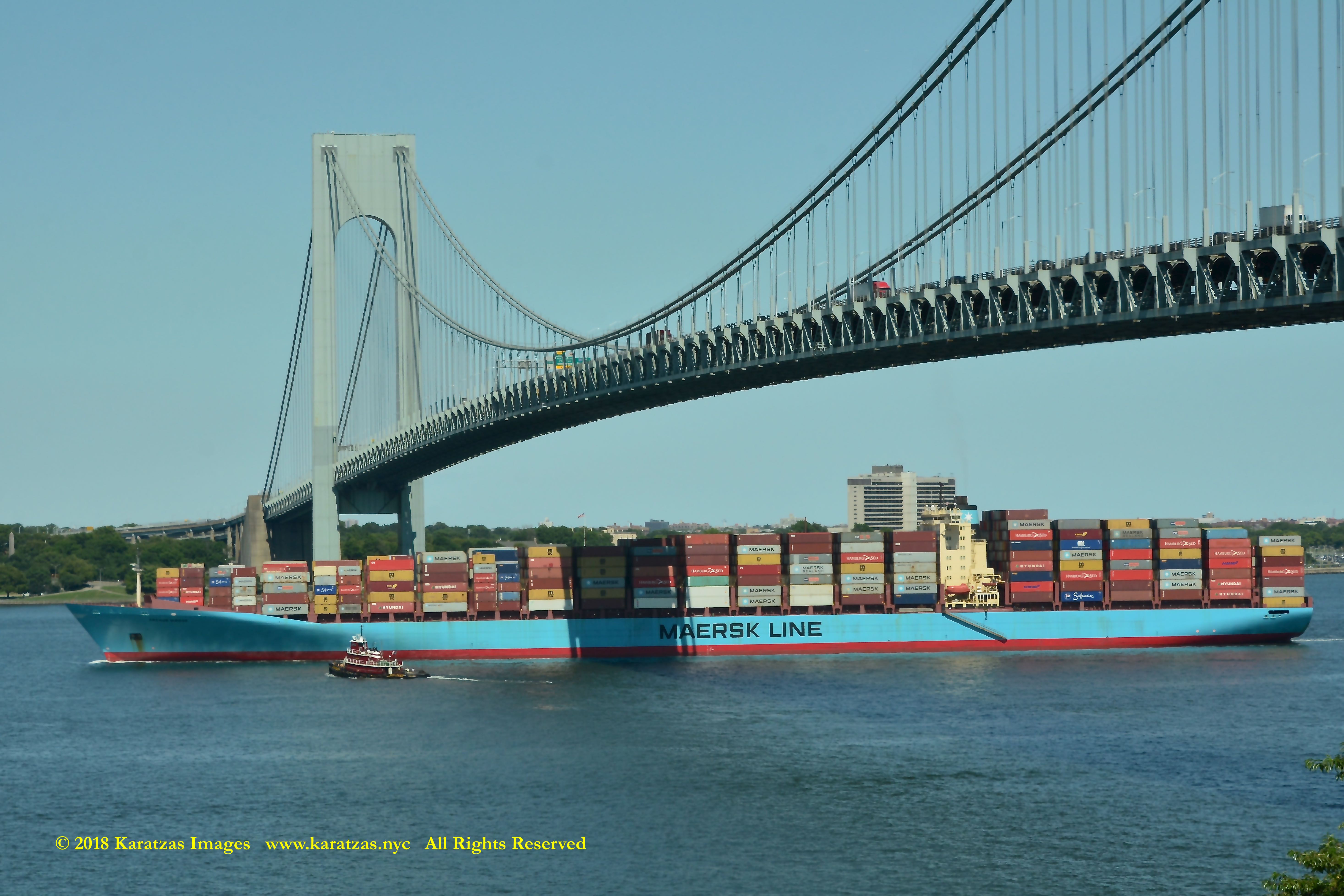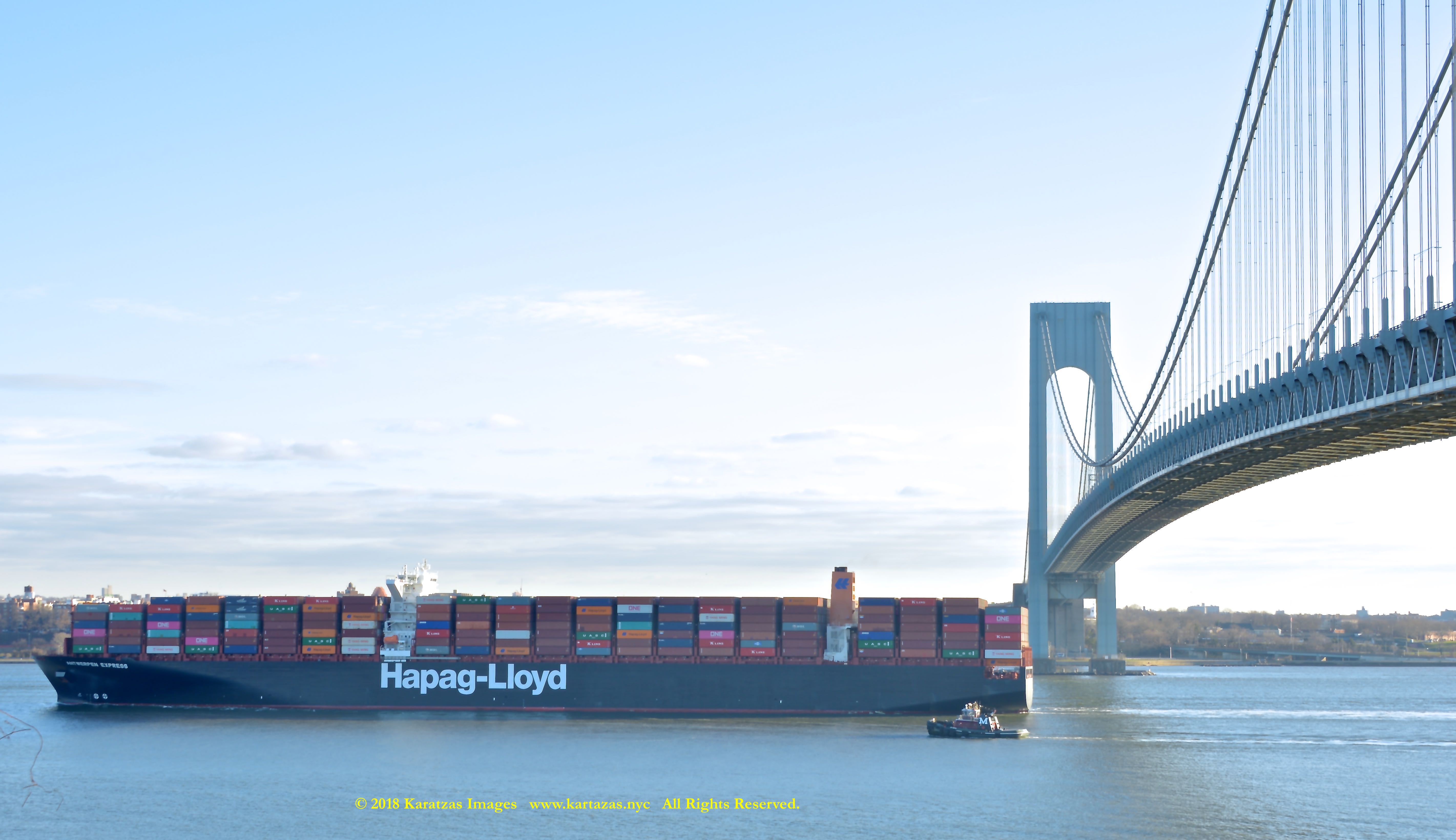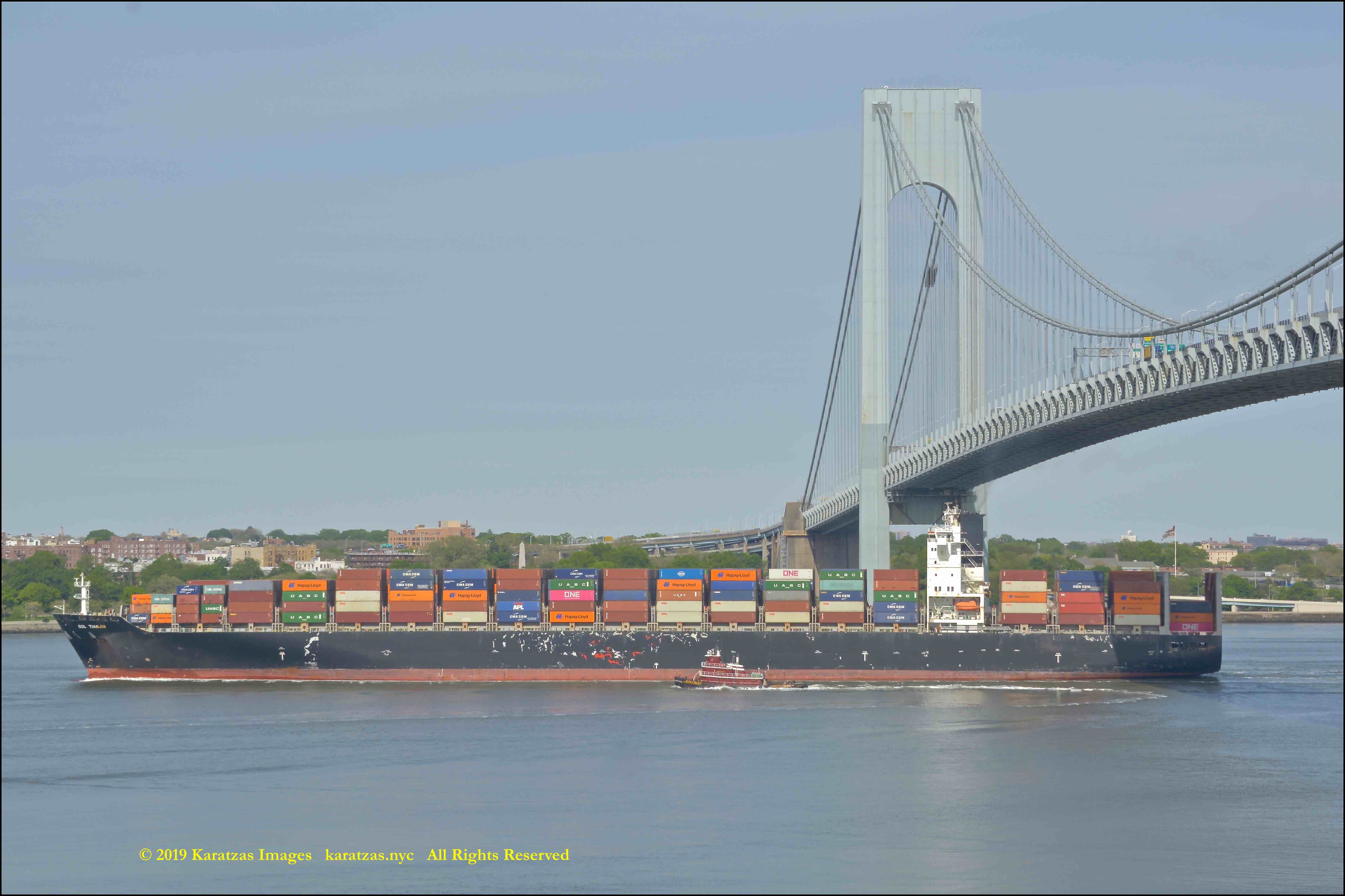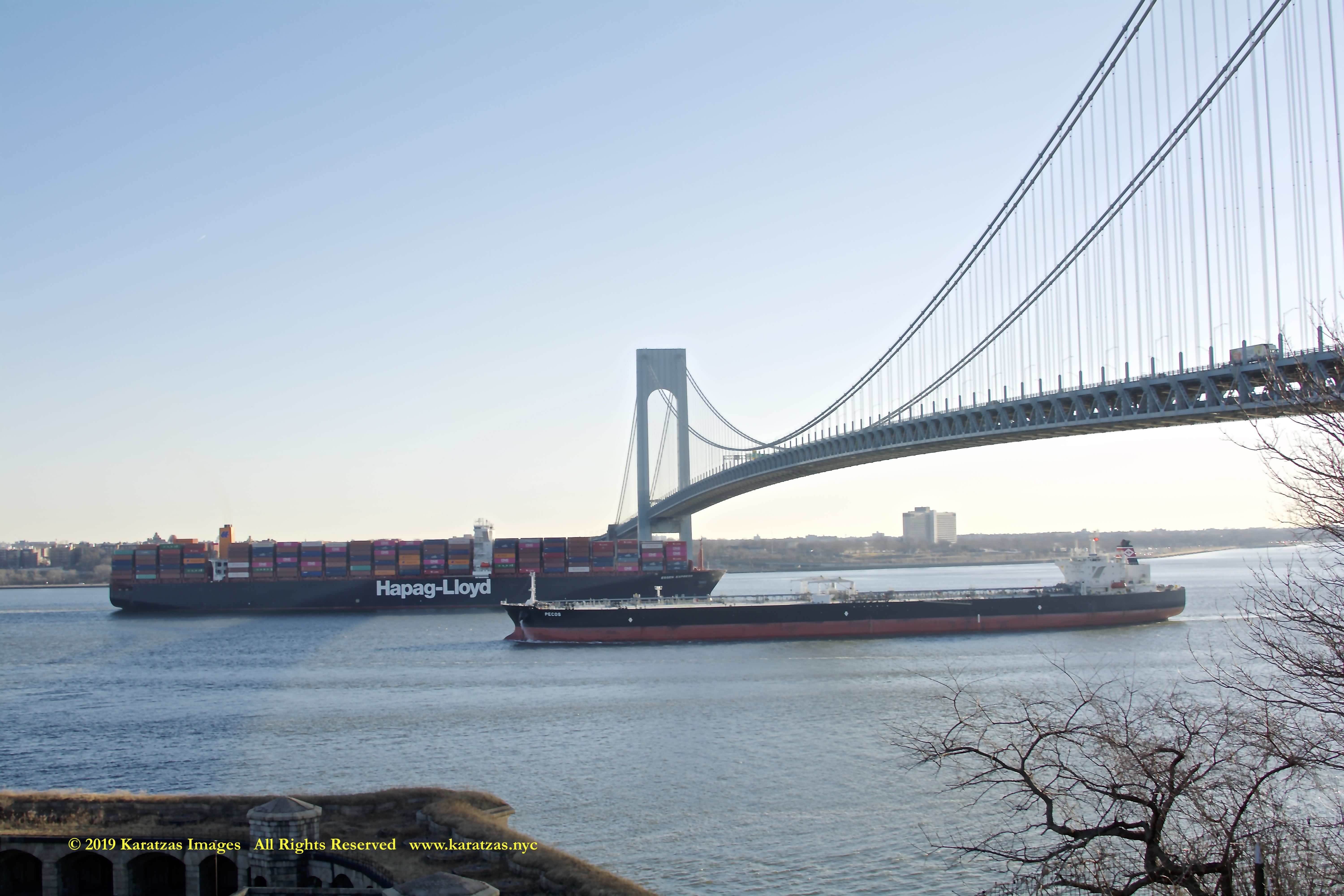 Images of neo-panamax containership MV ‘GSL Tianjin’ entering the New York Harbor; seen here under the Verrazzano-Narrows Bridge. Image credit: Karatzas Images