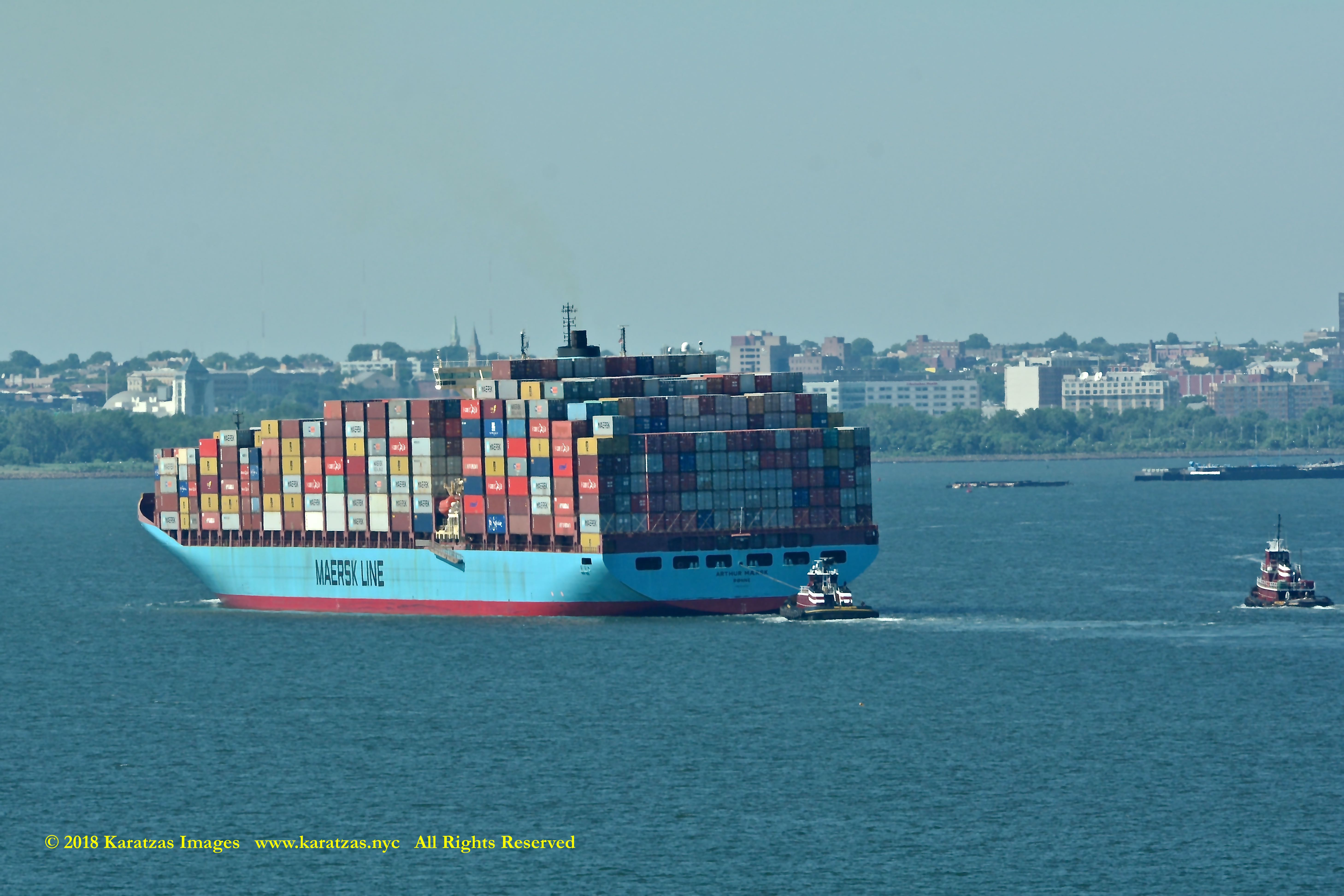 Images of neo-panamax containership MV ‘GSL Tianjin’ entering the New York Harbor; detail of the aft section and the Moran harbor tug in attendance. Image credit: Karatzas Images