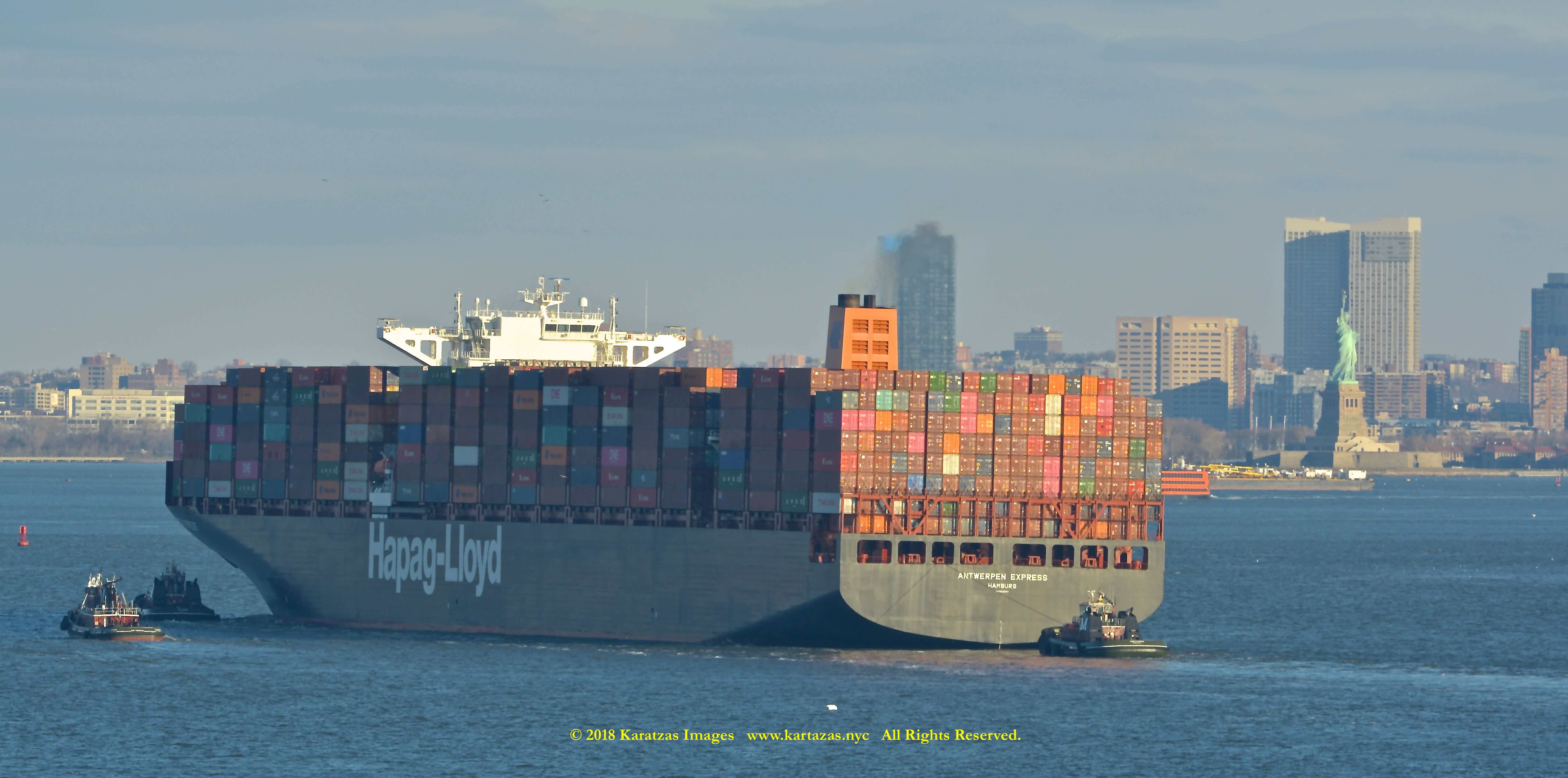 Images of neo-panamax containership MV ‘GSL Tianjin’ entering the New York Harbor; detail of the Moran harbor tugs in attendance. Image credit: Karatzas Images