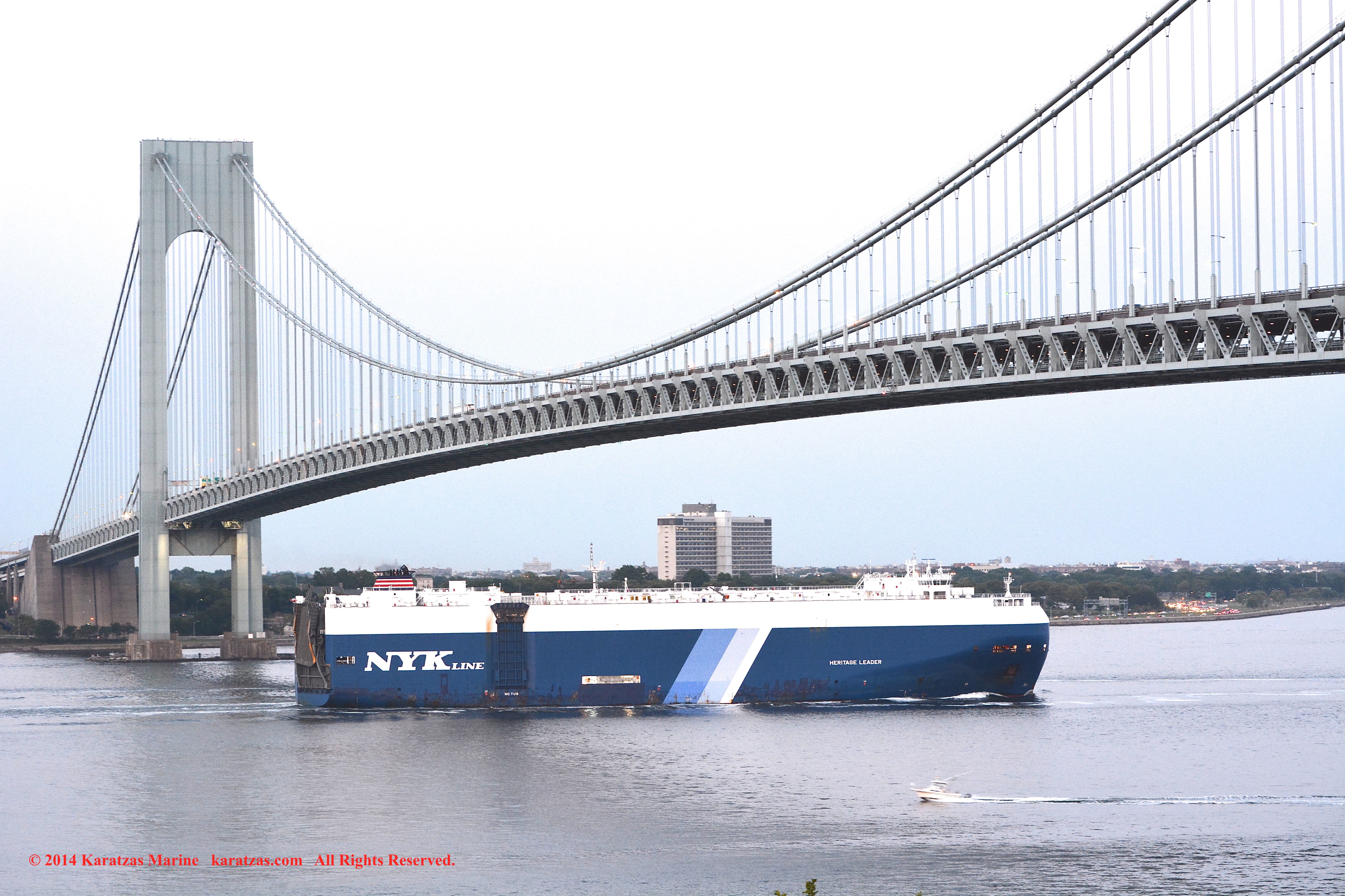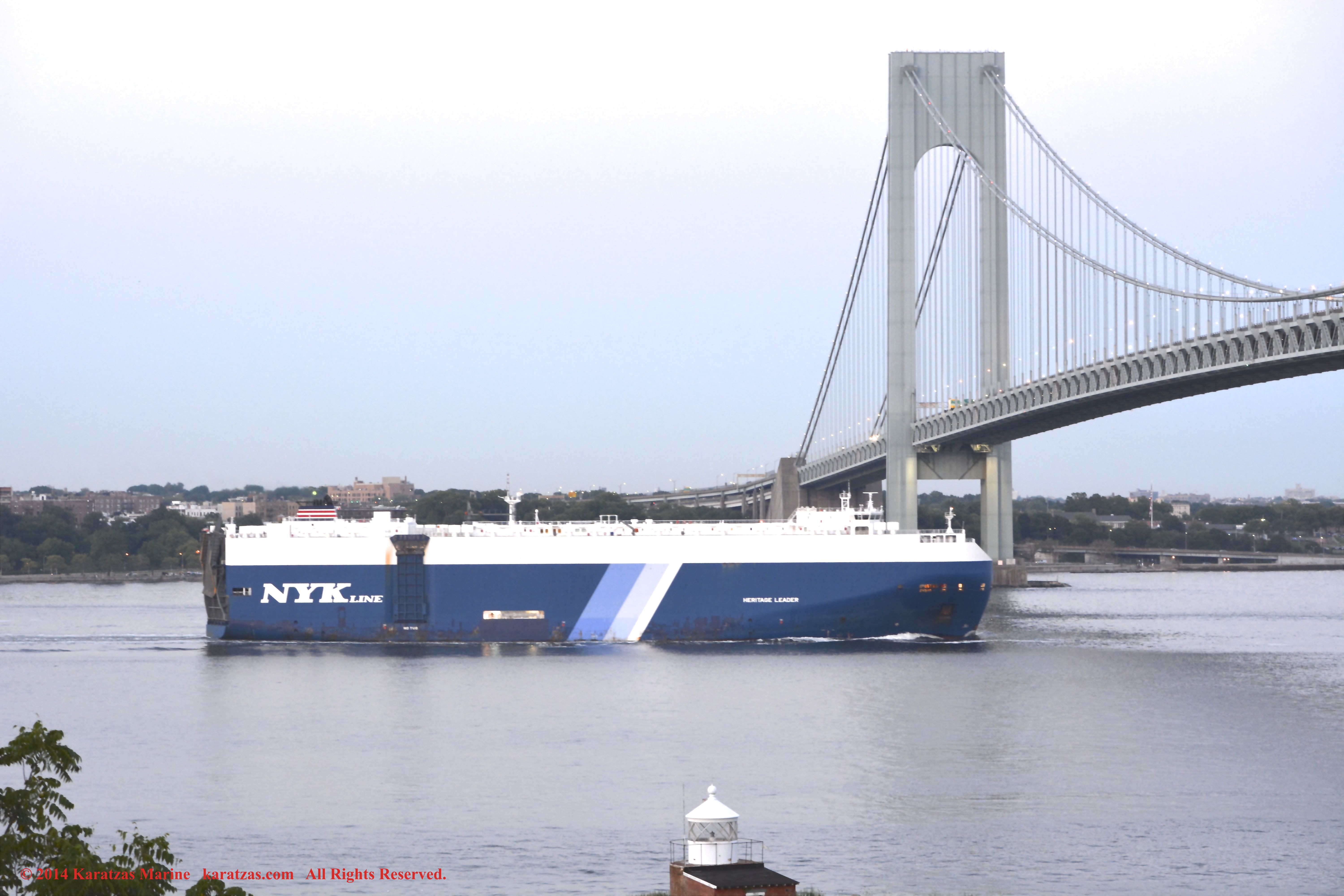 Car Carrier MV ‘Cygnus Leader’ arriving at New York Harbor on rainy summer afternoon. Crossing paths with cruiseship MV ‘Carnival Splendor’ (outbound) under Verrazano-Narrows Bridge. karatzas.com
