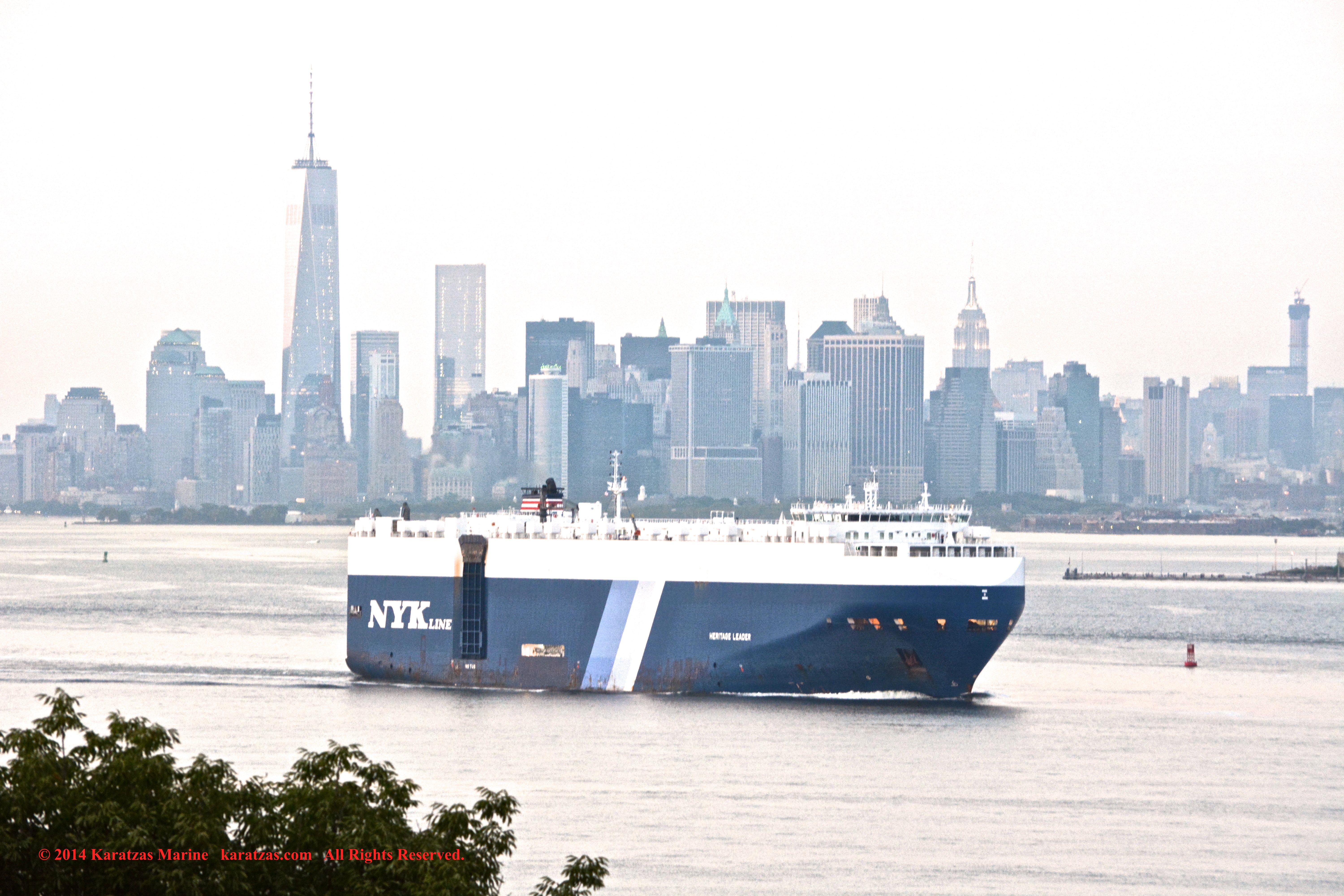 Car Carrier MV ‘Cygnus Leader’ arriving at New York Harbor on rainy summer afternoon. Manhattan skyline in the background. karatzas.com