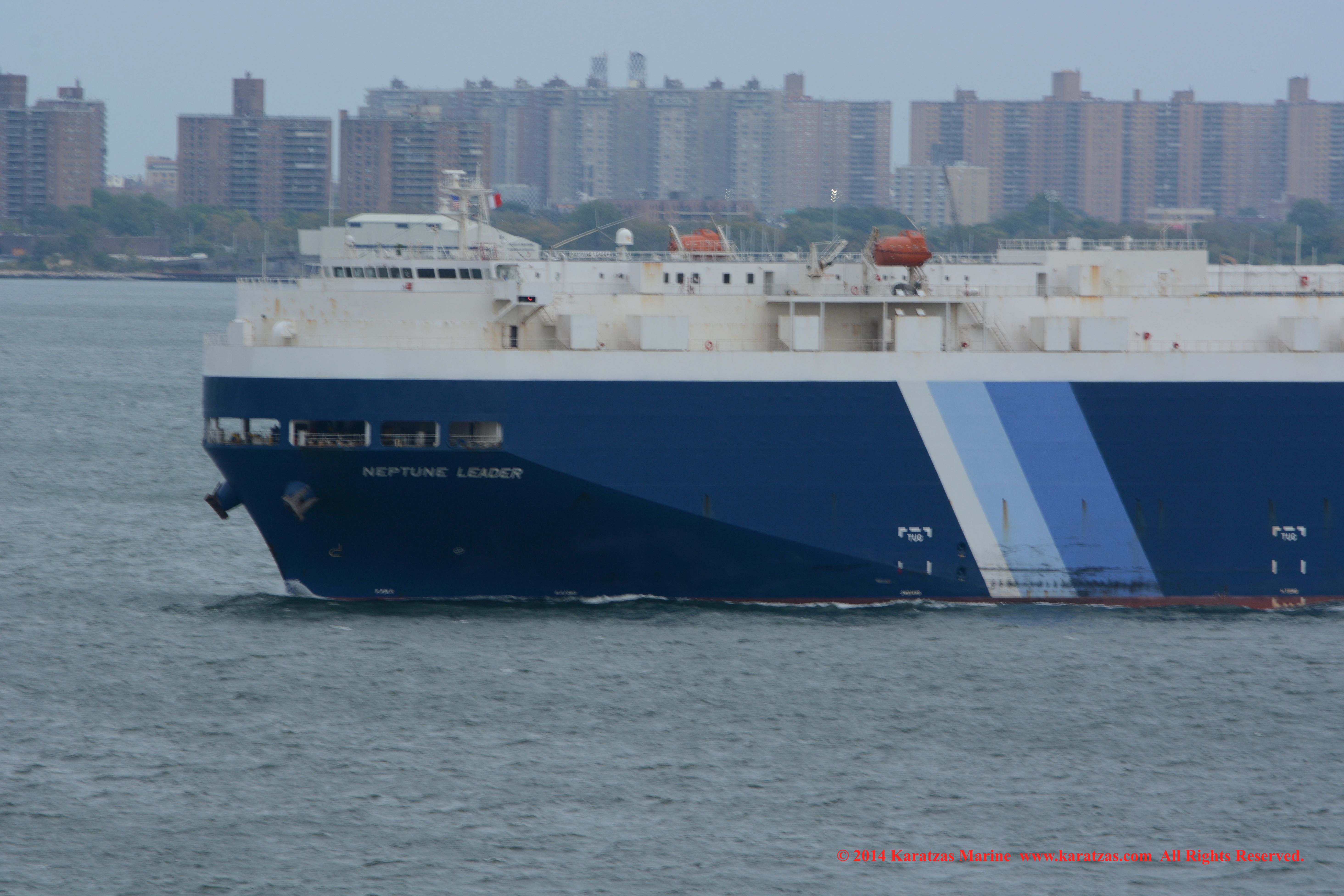 Brightly colored in the NYK corporate colors, supramax vessel MV ‘Global Vision’ pictured here sailing downstream on Hudson River under the George Washington Bridge (GWB) and the Manhattan skyline. Bow detail. Image credit: Karatzas Images.