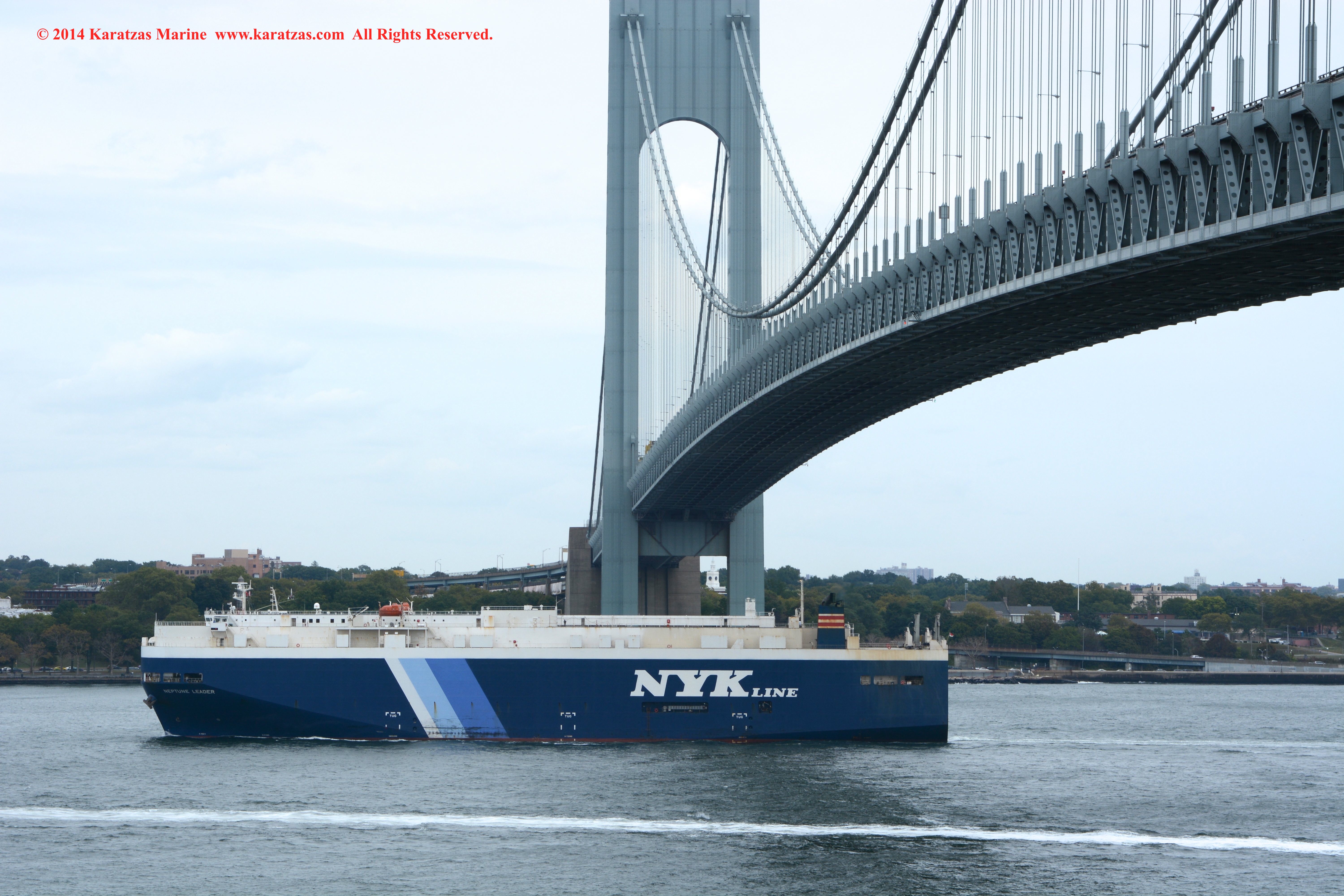 Brightly colored in the NYK corporate colors, supramax vessel MV ‘Global Vision’ pictured here sailing downstream on Hudson River under the George Washington Bridge (GWB) and the Manhattan skyline. Dry bulk vessel MV ‘Spring Sunshine’ seen sailing upstream. Image credit: Karatzas Images.