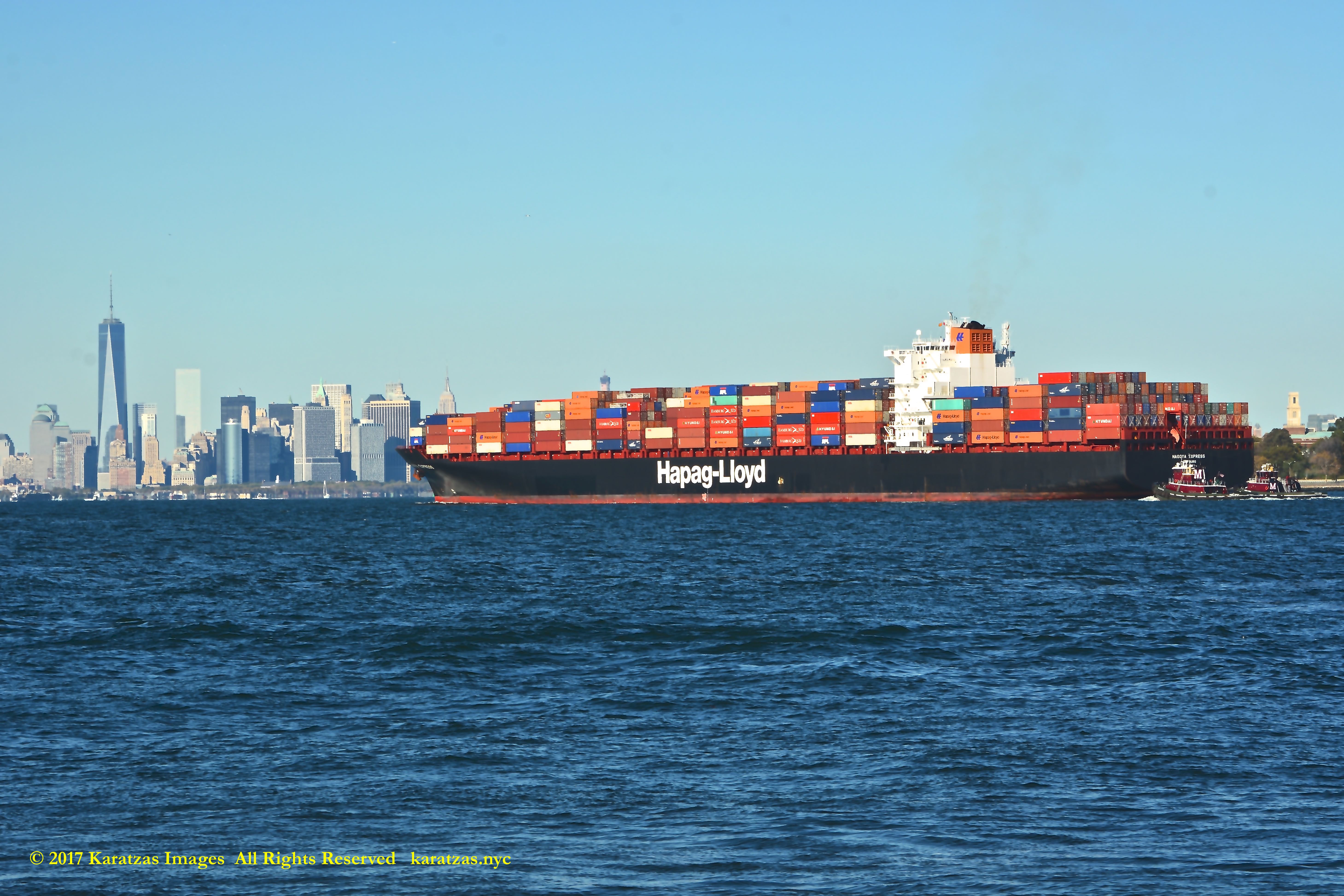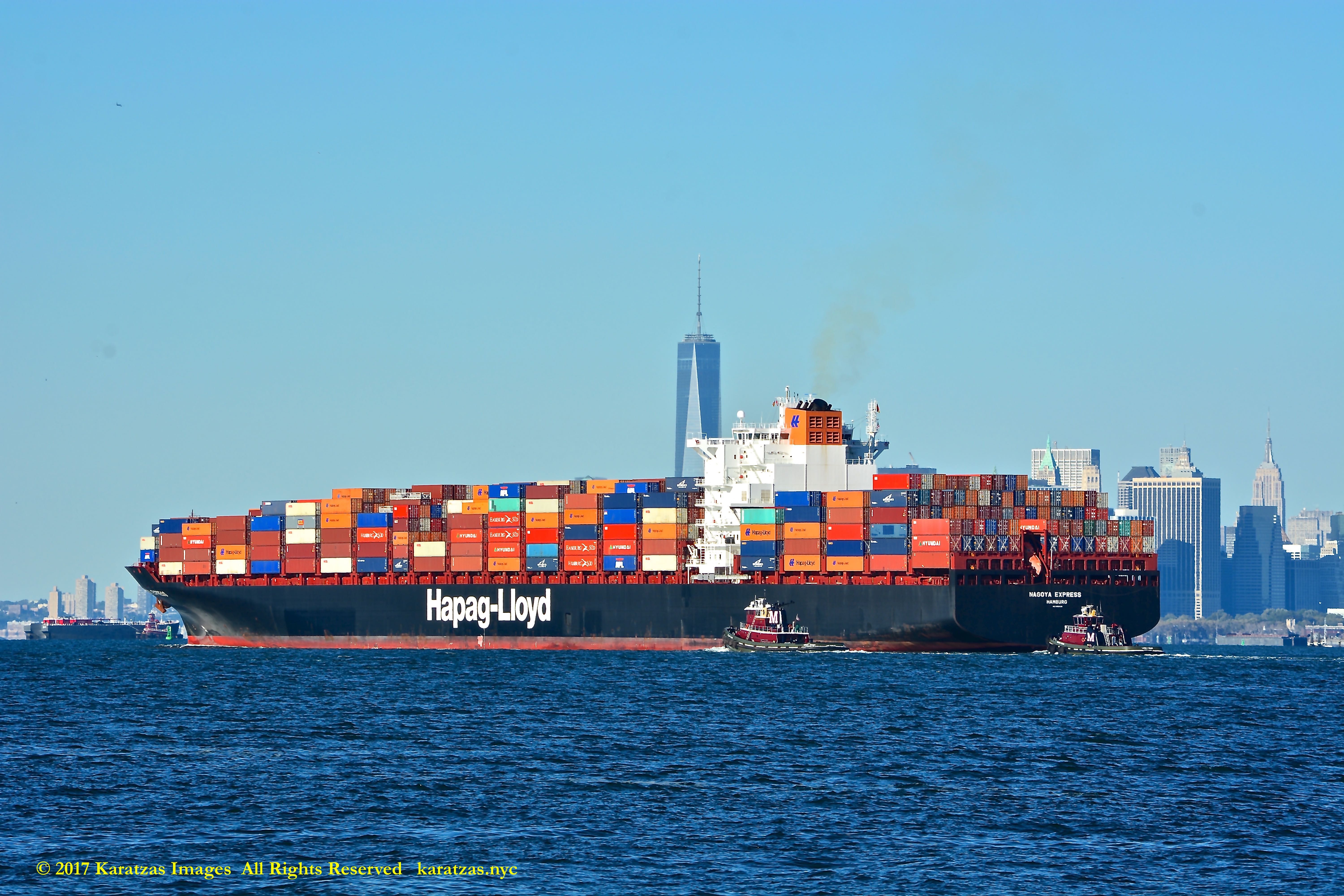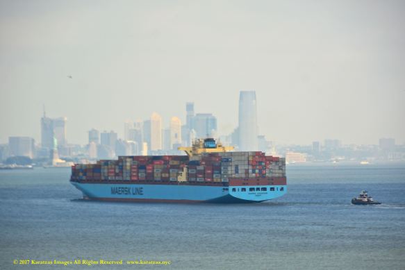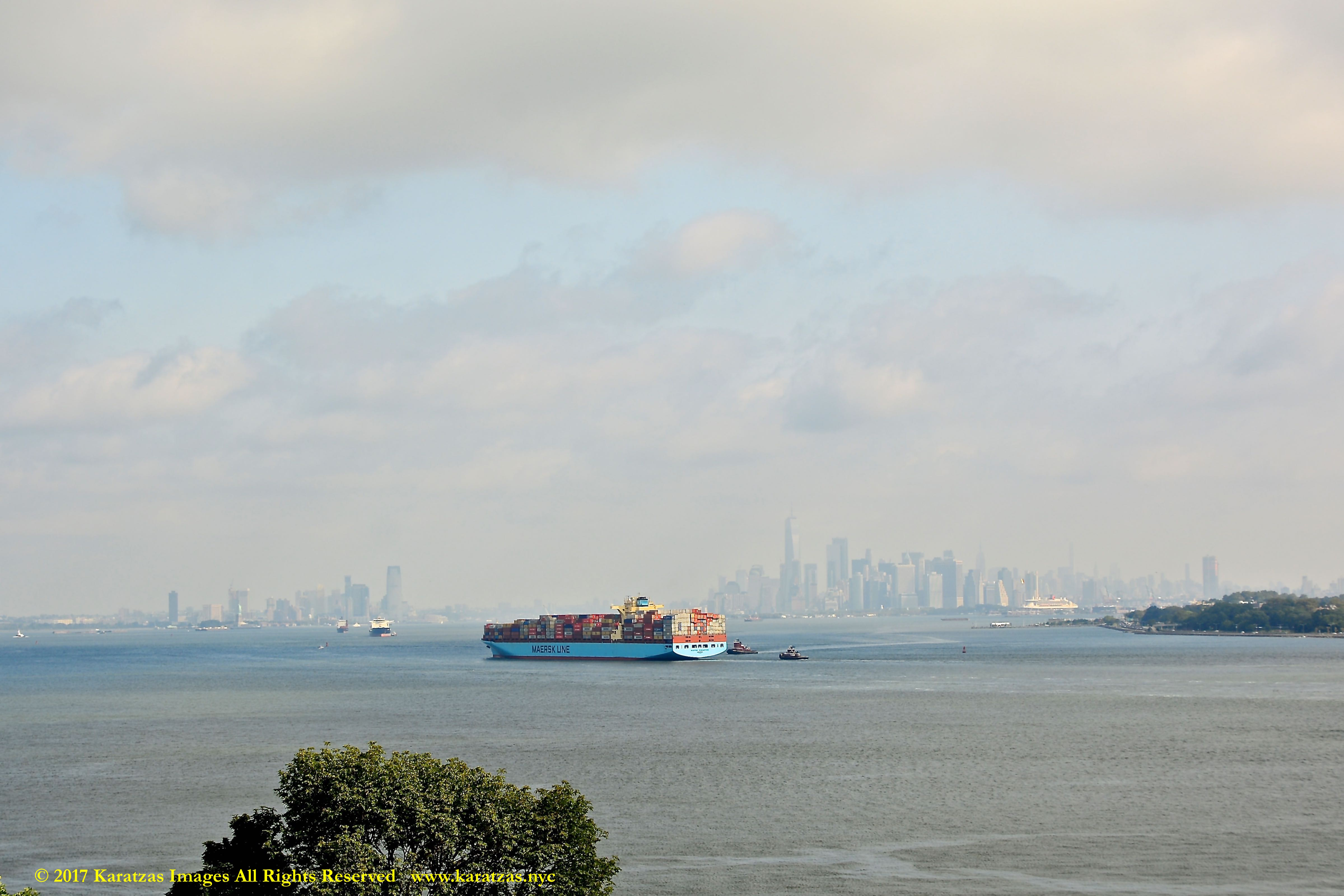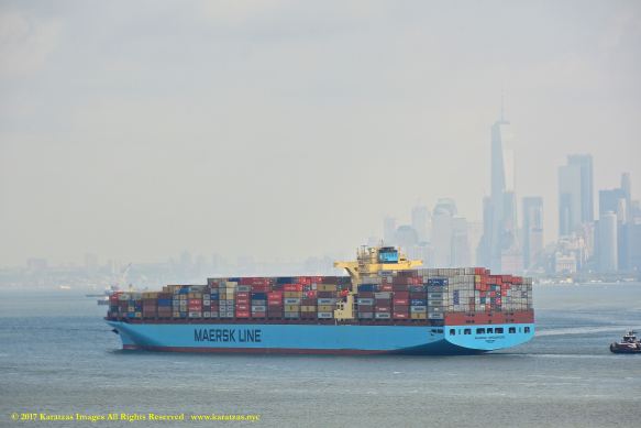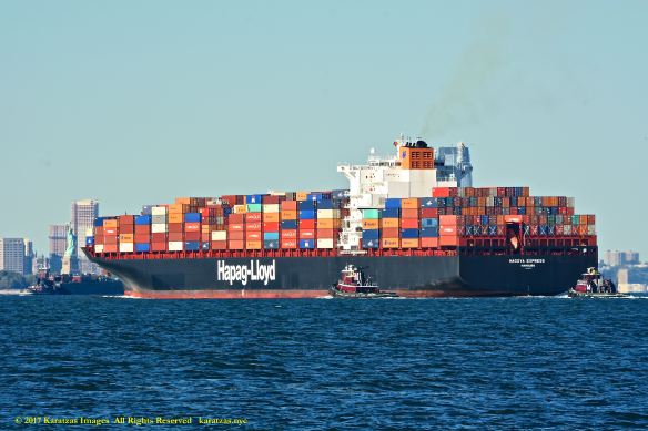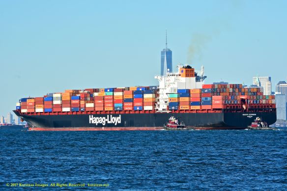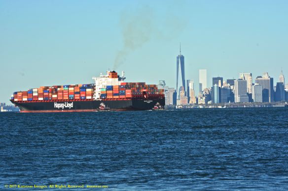 Brightly pained containership MV ‘ONE Magnificence’ (6,700 teu, built in 2010 at MHI in Kobe, Japan) arriving at GCT Bayonne Terminal in New York. Tow Moran harbor tugs (visible), orange-painted Staten Island ferry. Image credit: Karatzas Images
