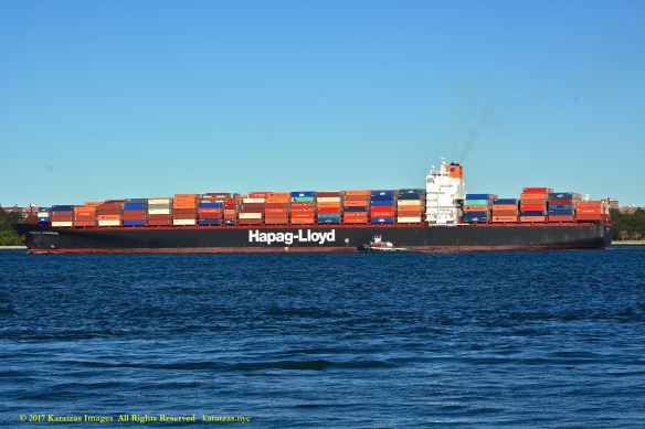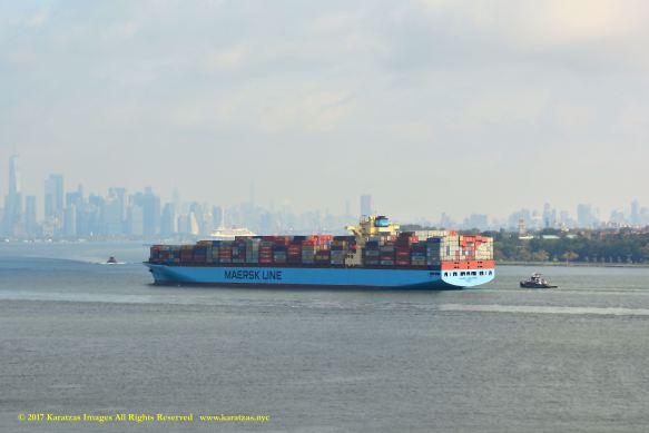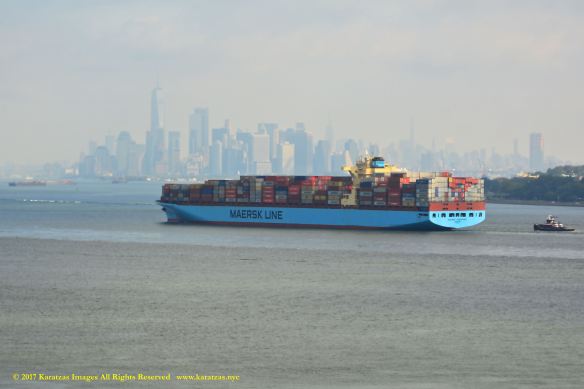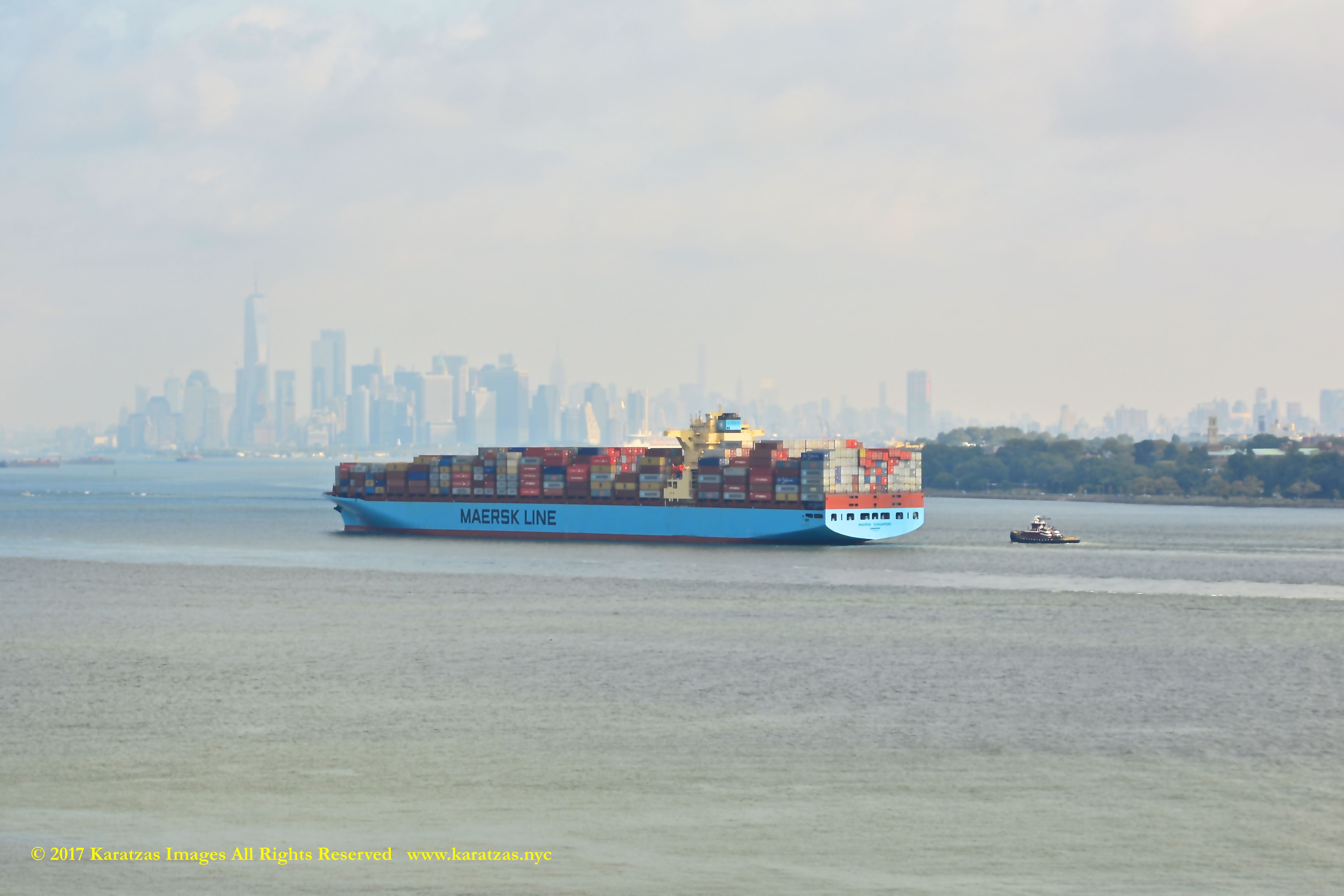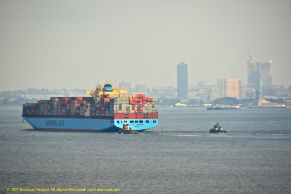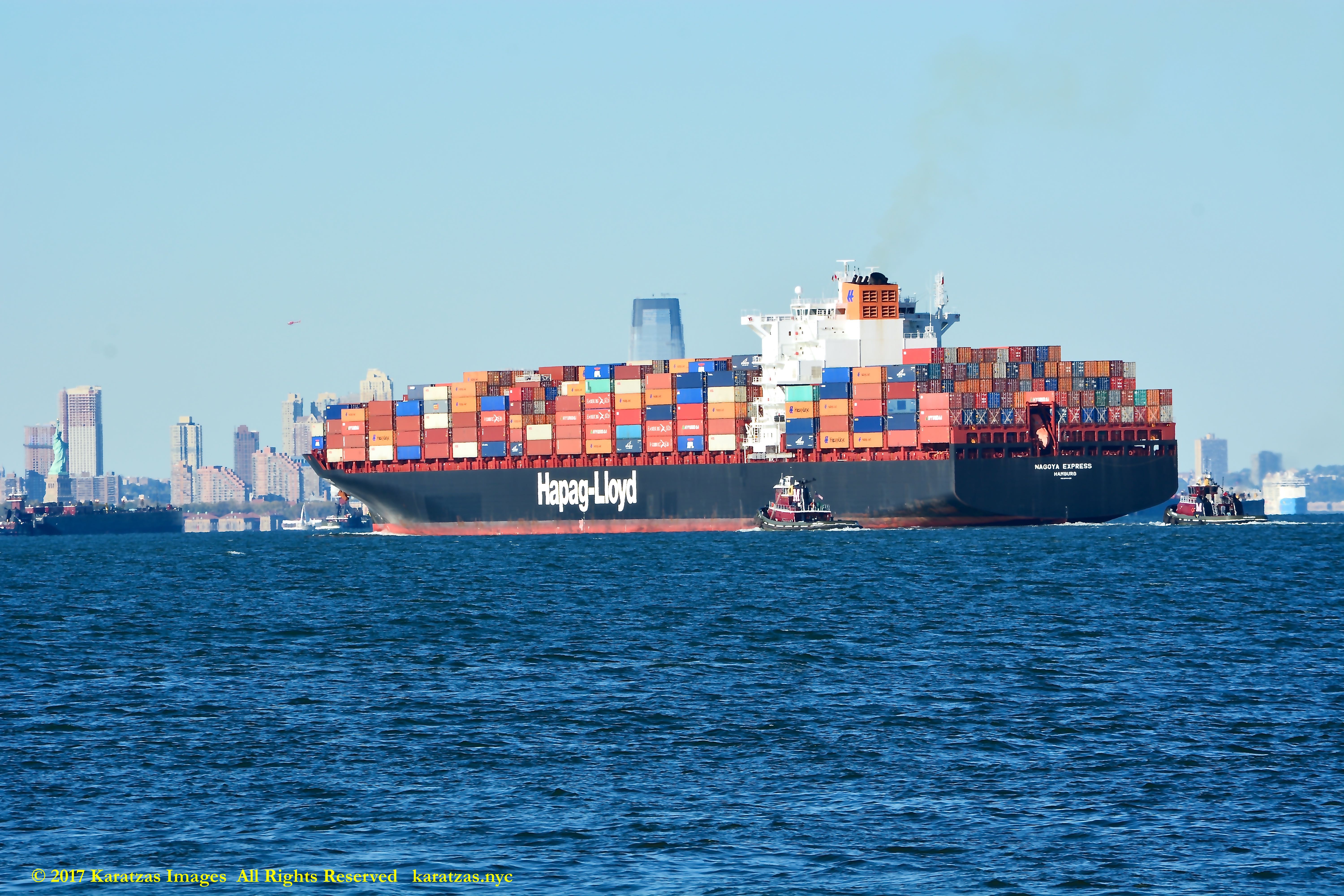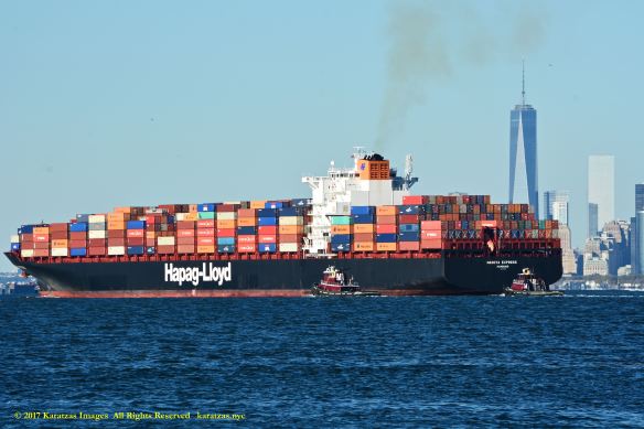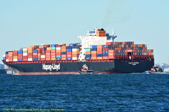 Brightly pained containership MV ‘ONE Magnificence’ (6,700 teu, built in 2010 at MHI in Kobe, Japan) arriving at GCT Bayonne Terminal in New York. Tow Moran harbor tugs (visible), orange-painted Staten Island ferry. Image credit: Karatzas Images