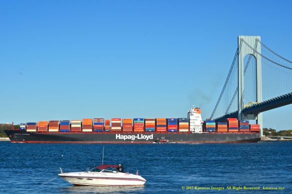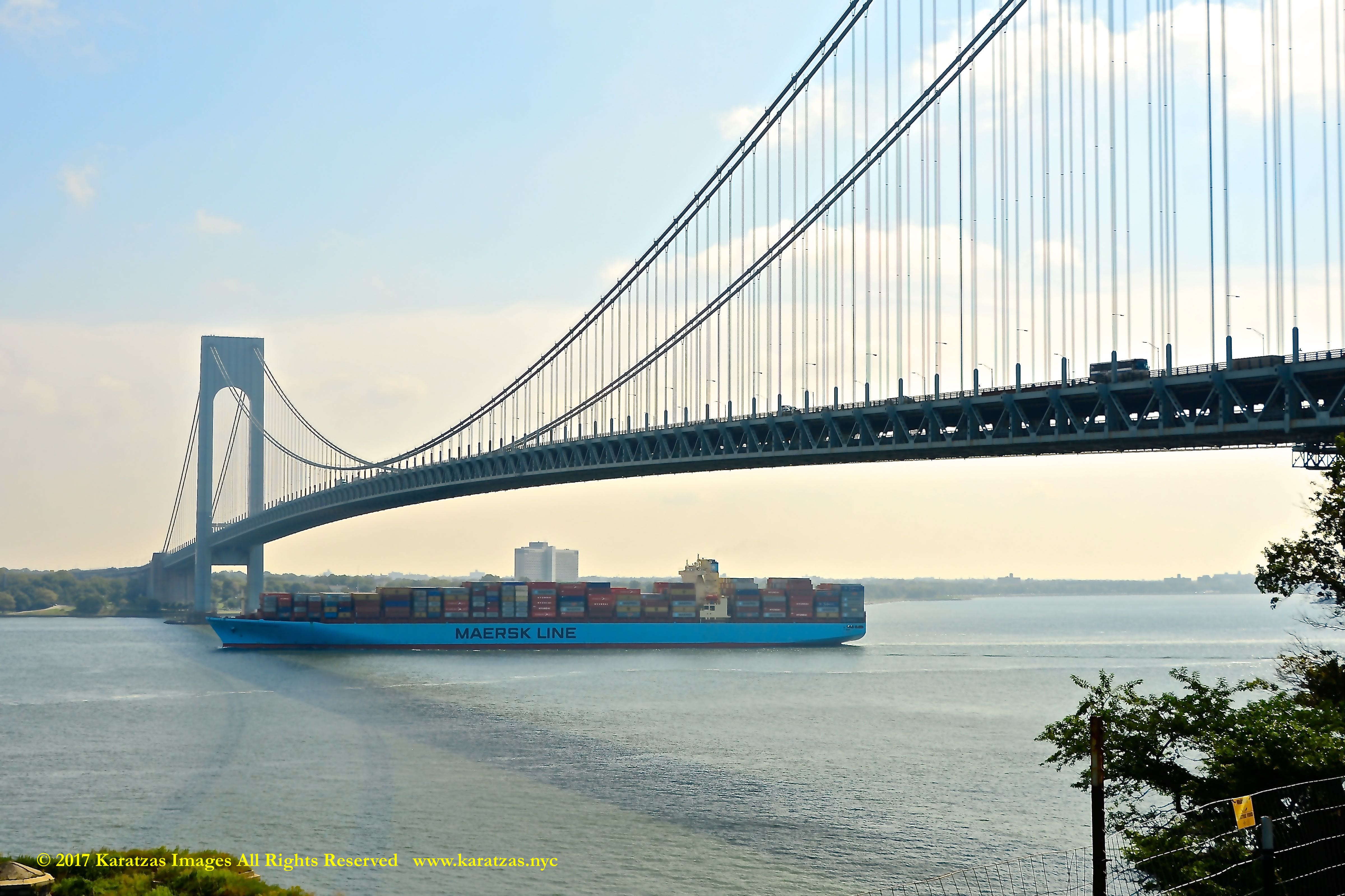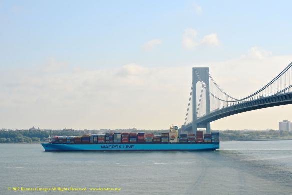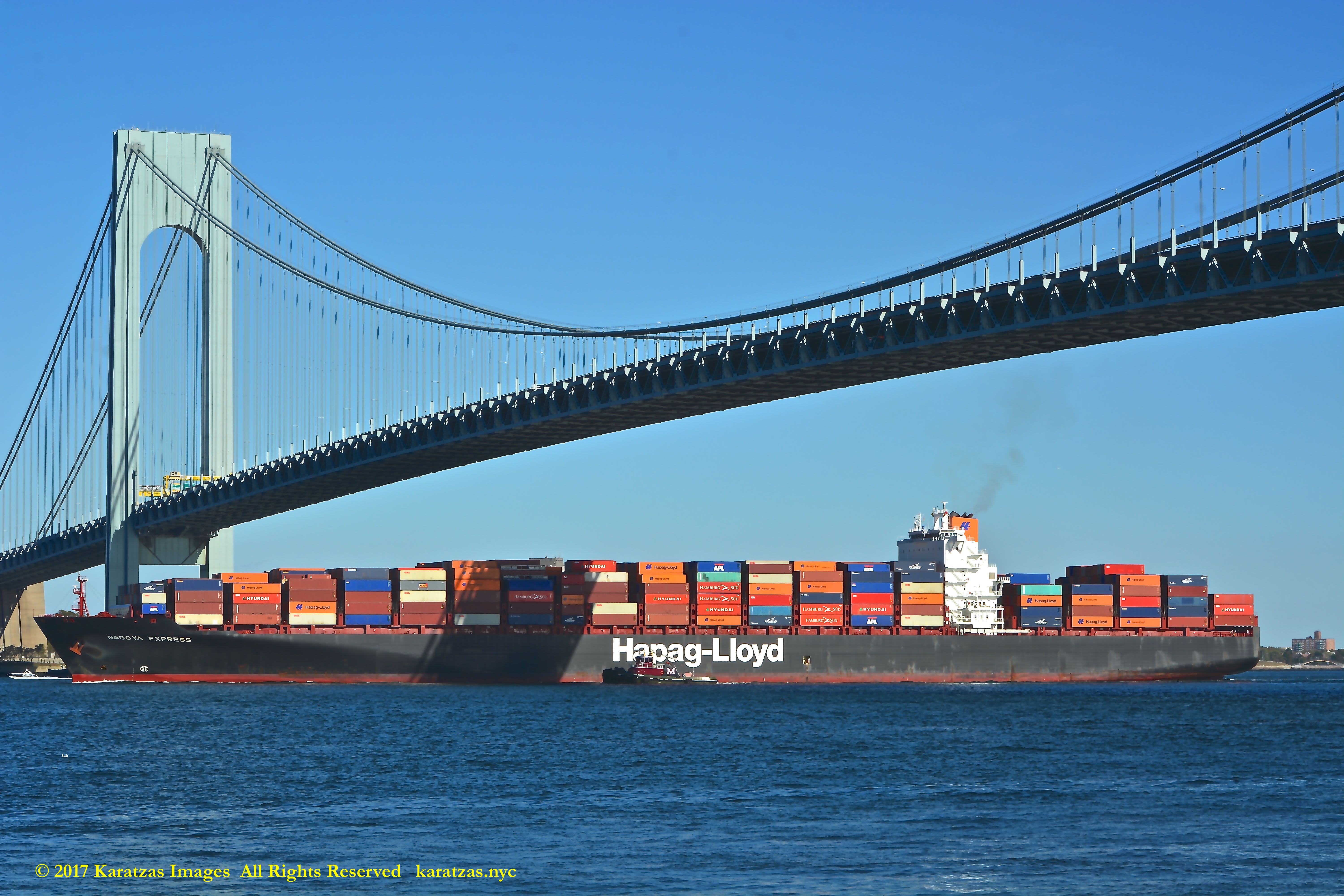 Brightly pained containership MV ‘ONE Magnificence’ (6,700 teu, built in 2010 at MHI in Kobe, Japan) arriving at GCT Bayonne Terminal in New York. Verrazzano-Narrows Bridge in the background. Image credit: Karatzas Images