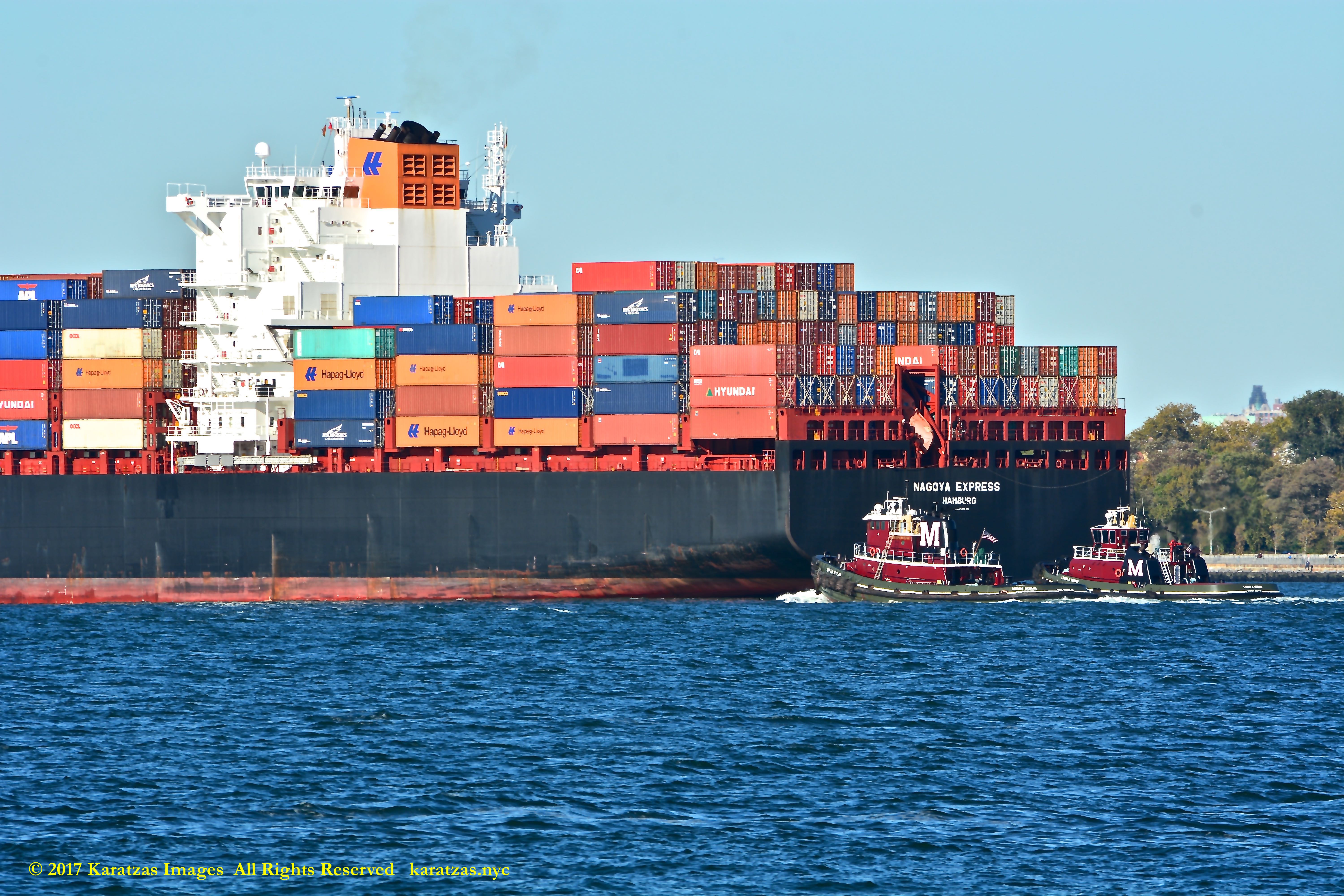 Brightly pained containership MV ‘ONE Magnificence’ (6,700 teu, built in 2010 at MHI in Kobe, Japan) arriving at GCT Bayonne Terminal in New York. Tow Moran harbor tugs (visible). Image credit: Karatzas Images