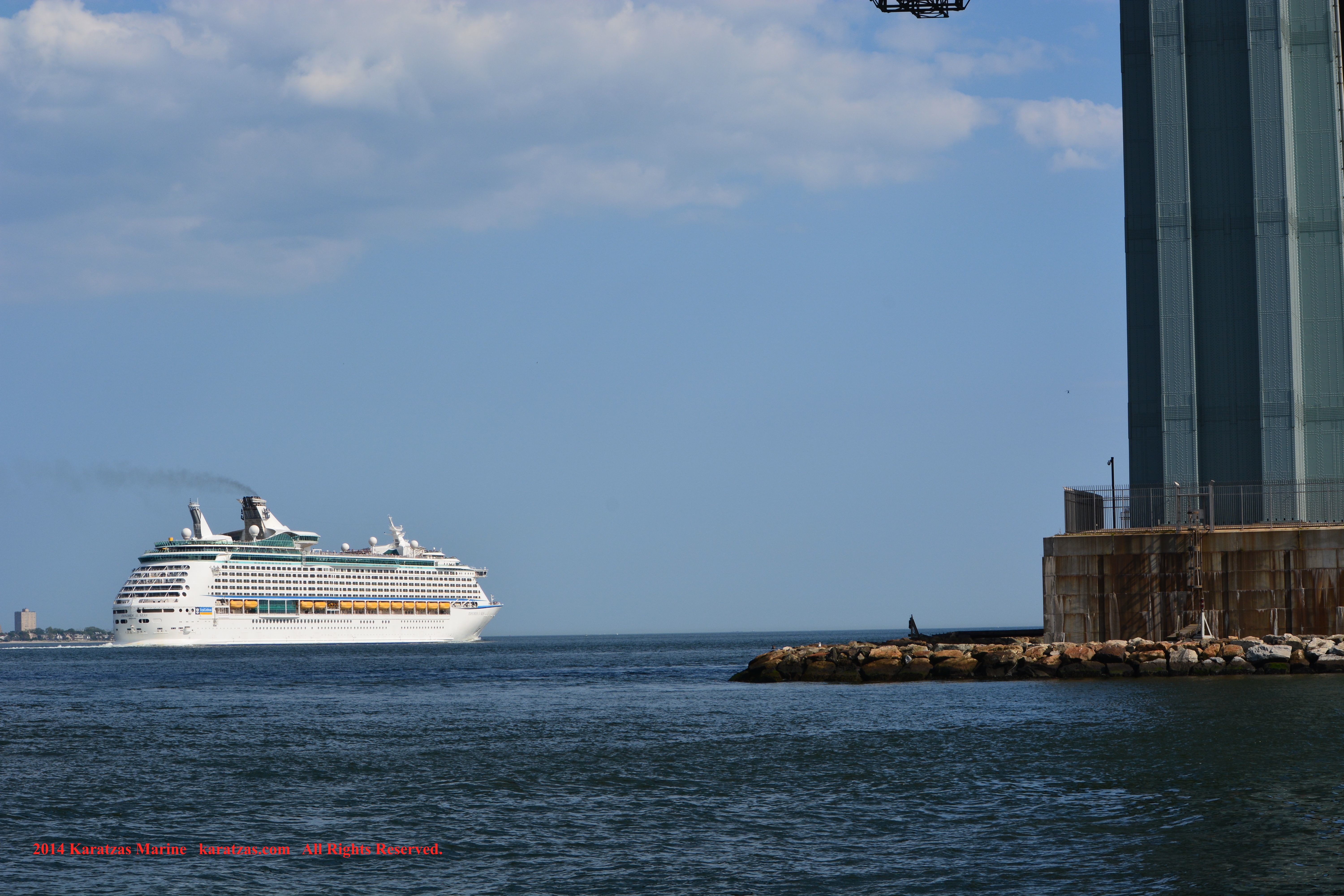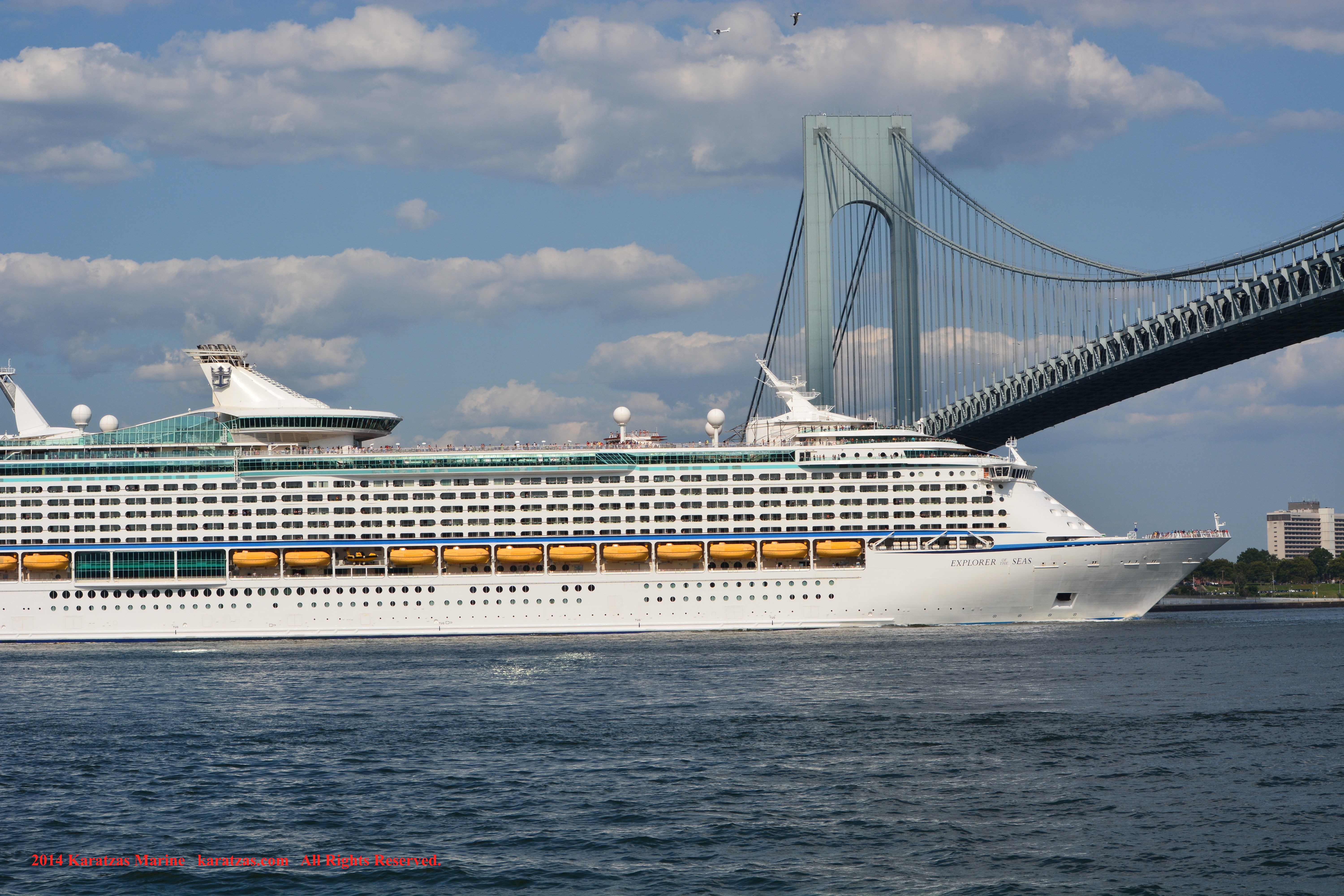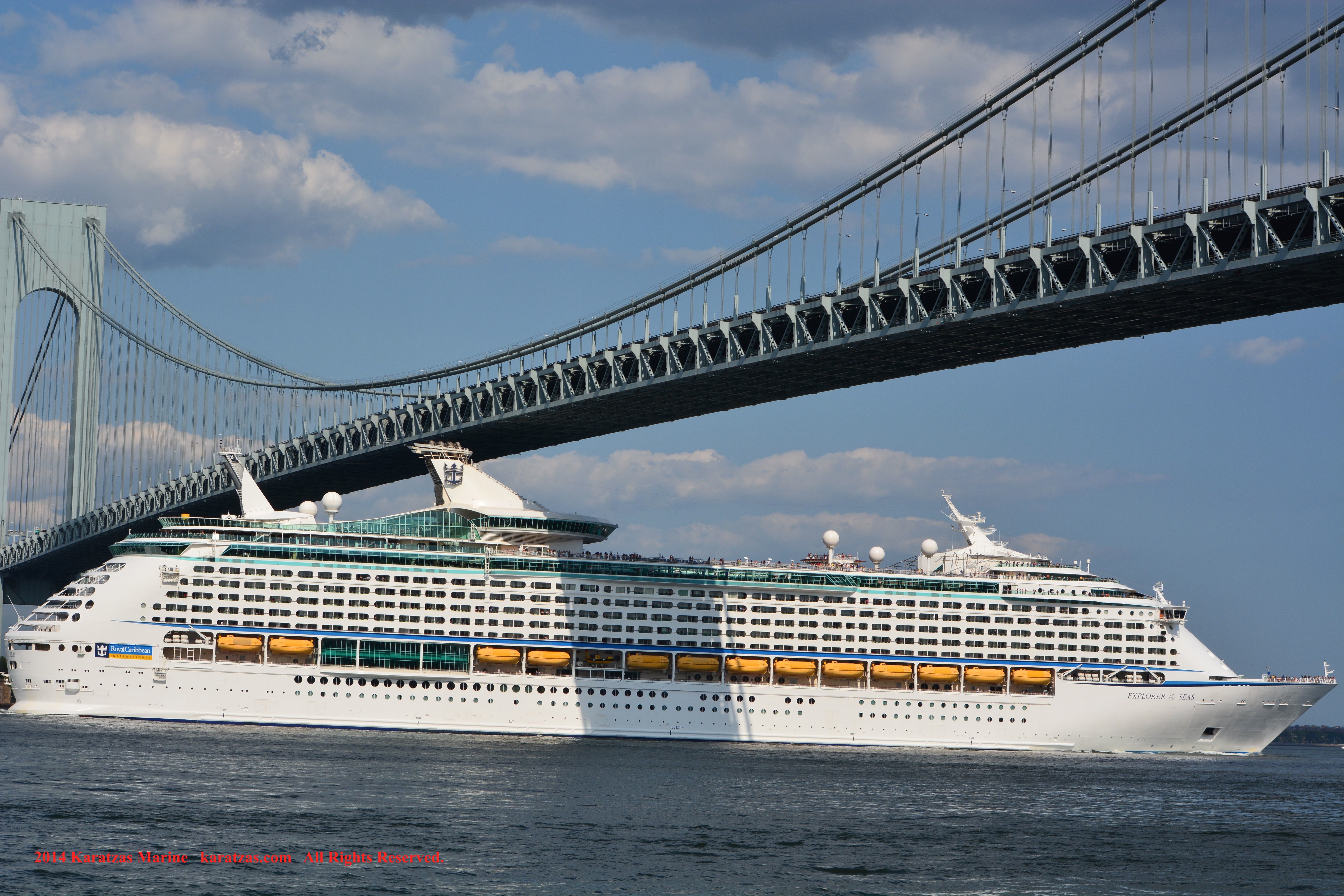 Royal Caribbean’s ‘Explorer of the Seas’ (3,100 berths, built at Kvaerner Masa in 2000) departing New York Harbor. Verrazano-Narrows Bridge aloft!   karatzas.com
