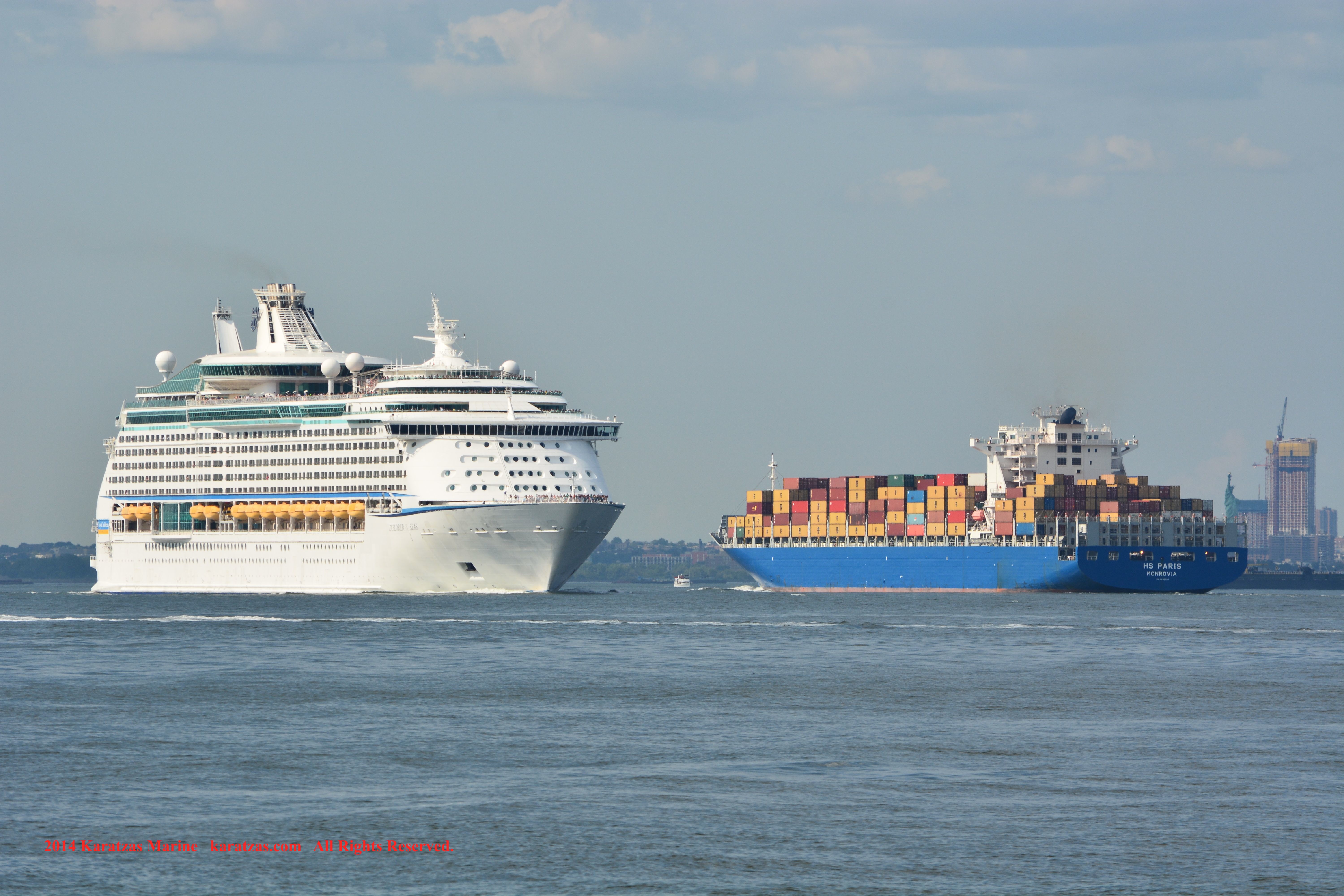 Royal Caribbean’s ‘Explorer of the Seas’ (3,100 berths, built at Kvaerner Masa in 2000) departing New York Harbor. Inbound ‘HS PARIS’ (6,500-teu containership)   karatzas.com