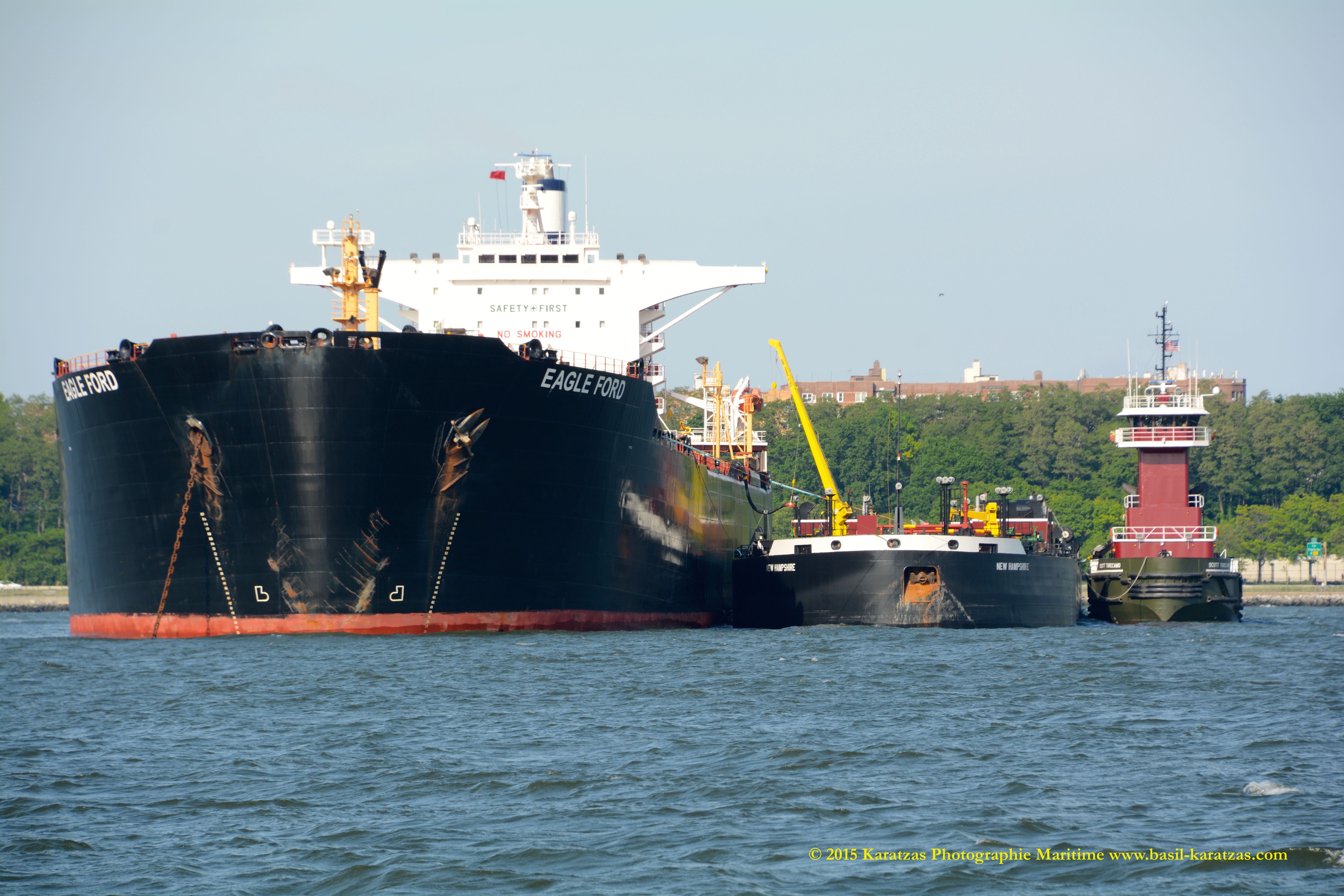 The rarest of all: ‘Eagle Ford’ suezmax tanker, built and flagged in the USA (Jones Act), while lightering crude oil to ATB ‘New Hampshire’ under the watch of tug ‘Scott Turecamo’. Image credit: Karatzas Images