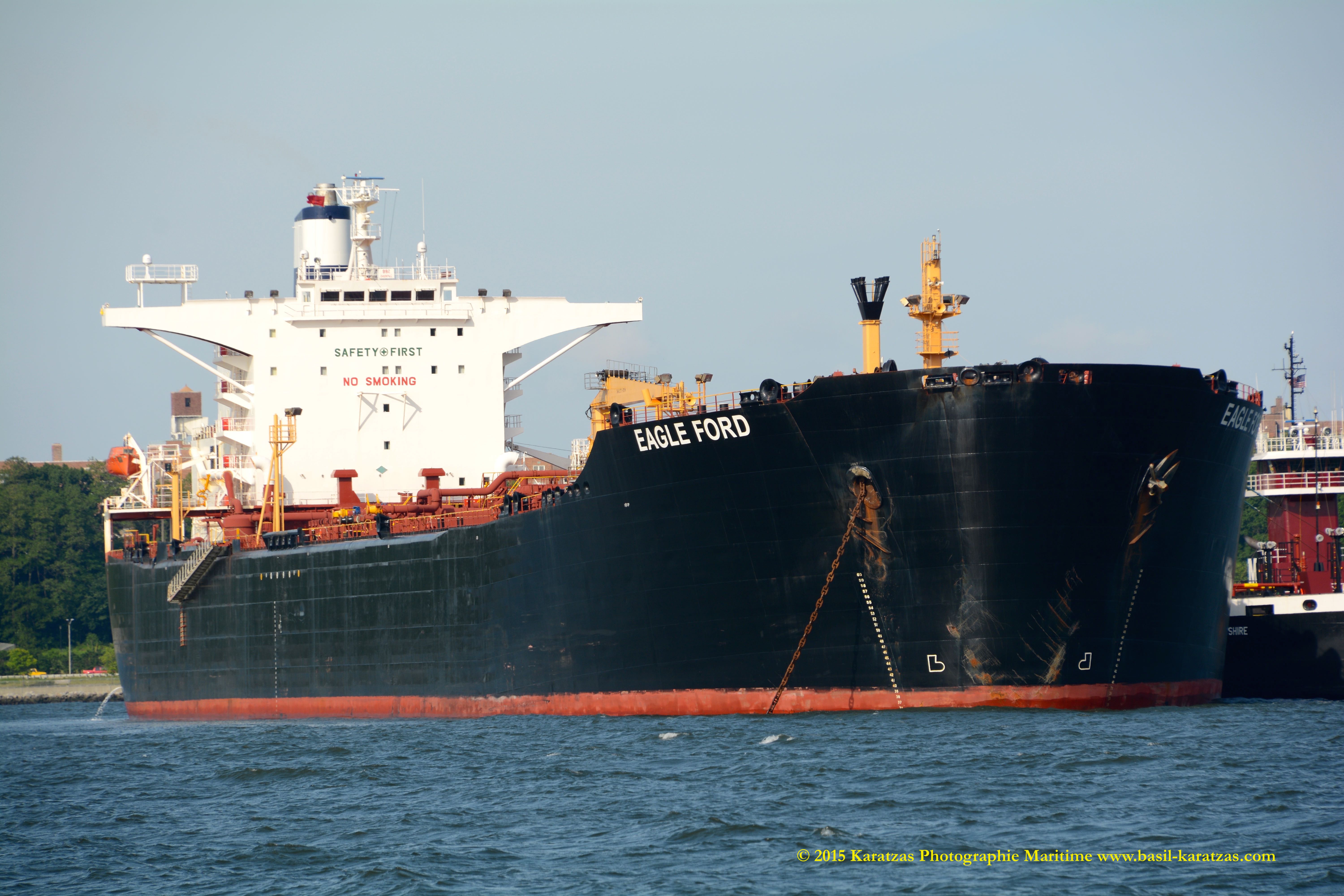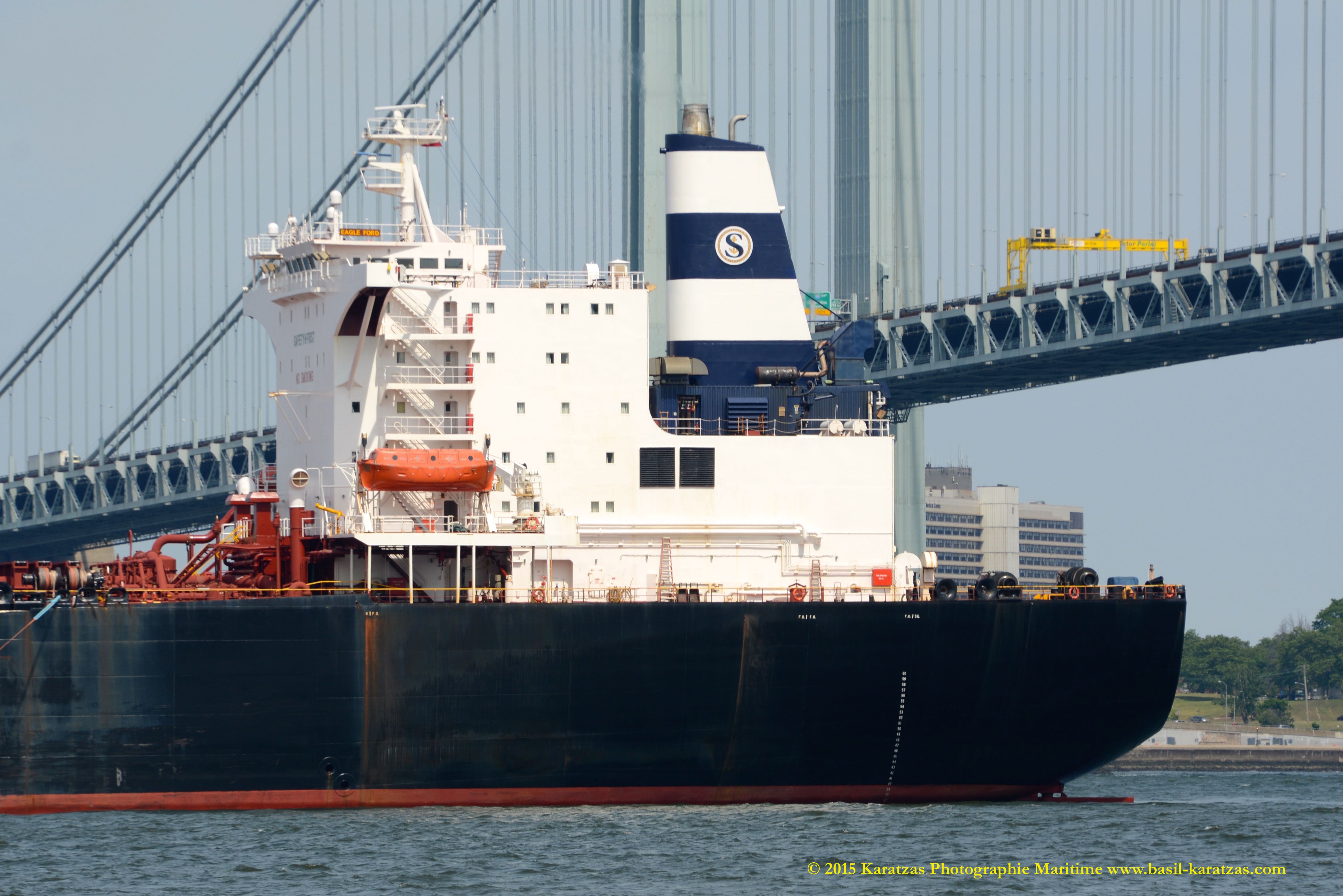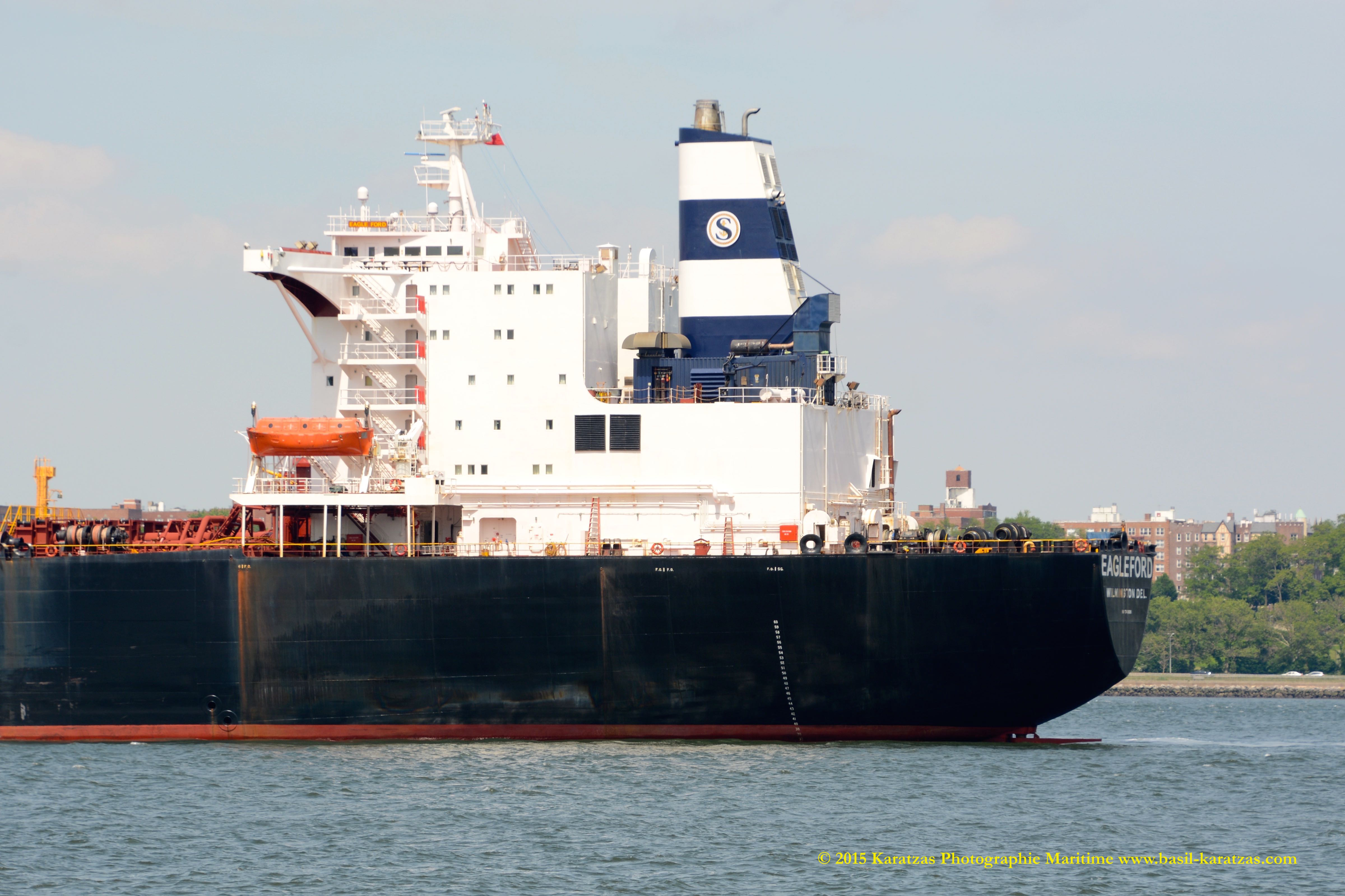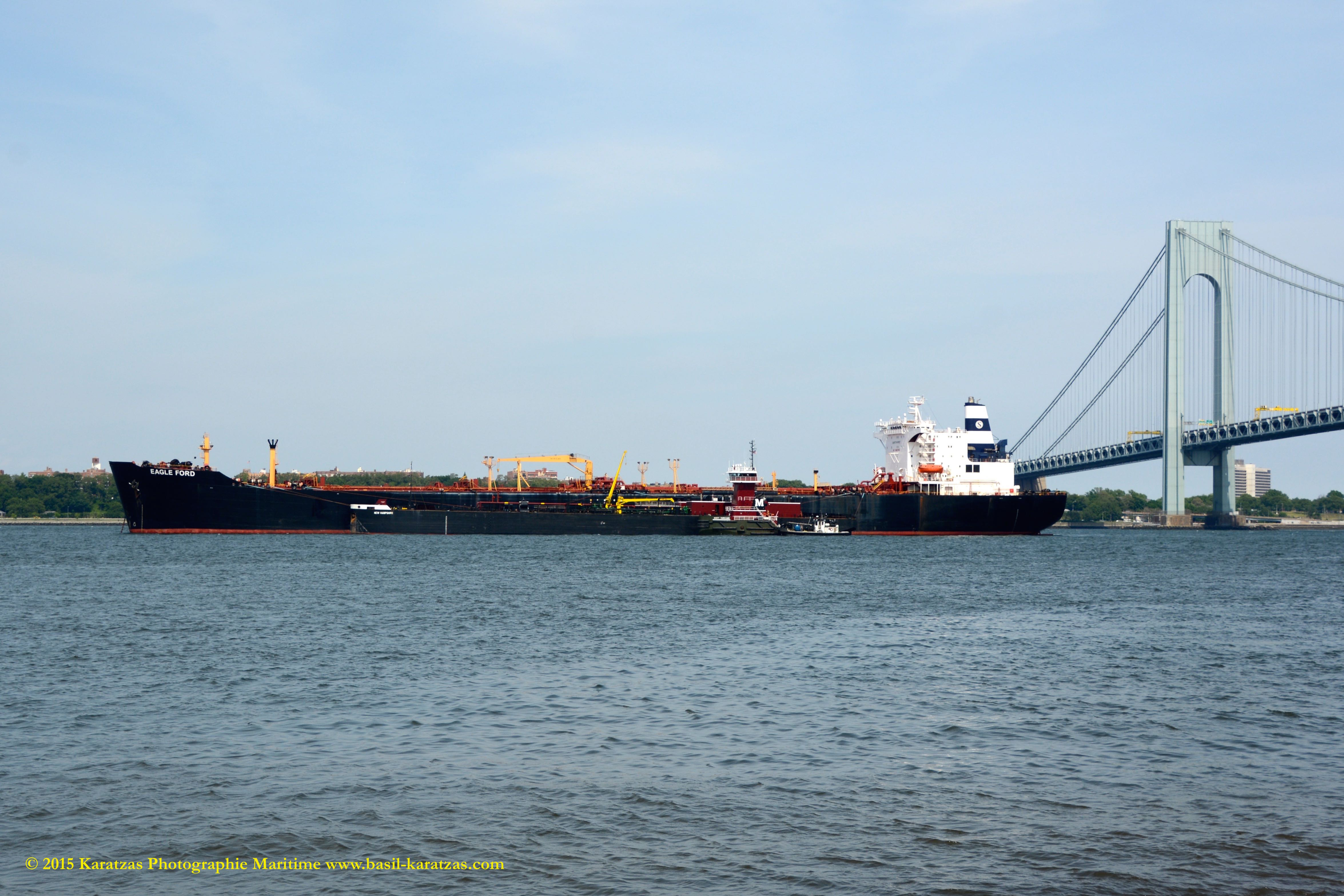 The rarest of all: ‘Eagle Ford’ suezmax tanker, built and flagged in the USA (Jones Act), formerly owned by SeaRiver (ExxonMobil subsidiary), while lightering crude oil to ATB ‘New Hampshire’ under the shadow of the Verrazano-Narrows Bridge.  Image credit: Karatzas Images