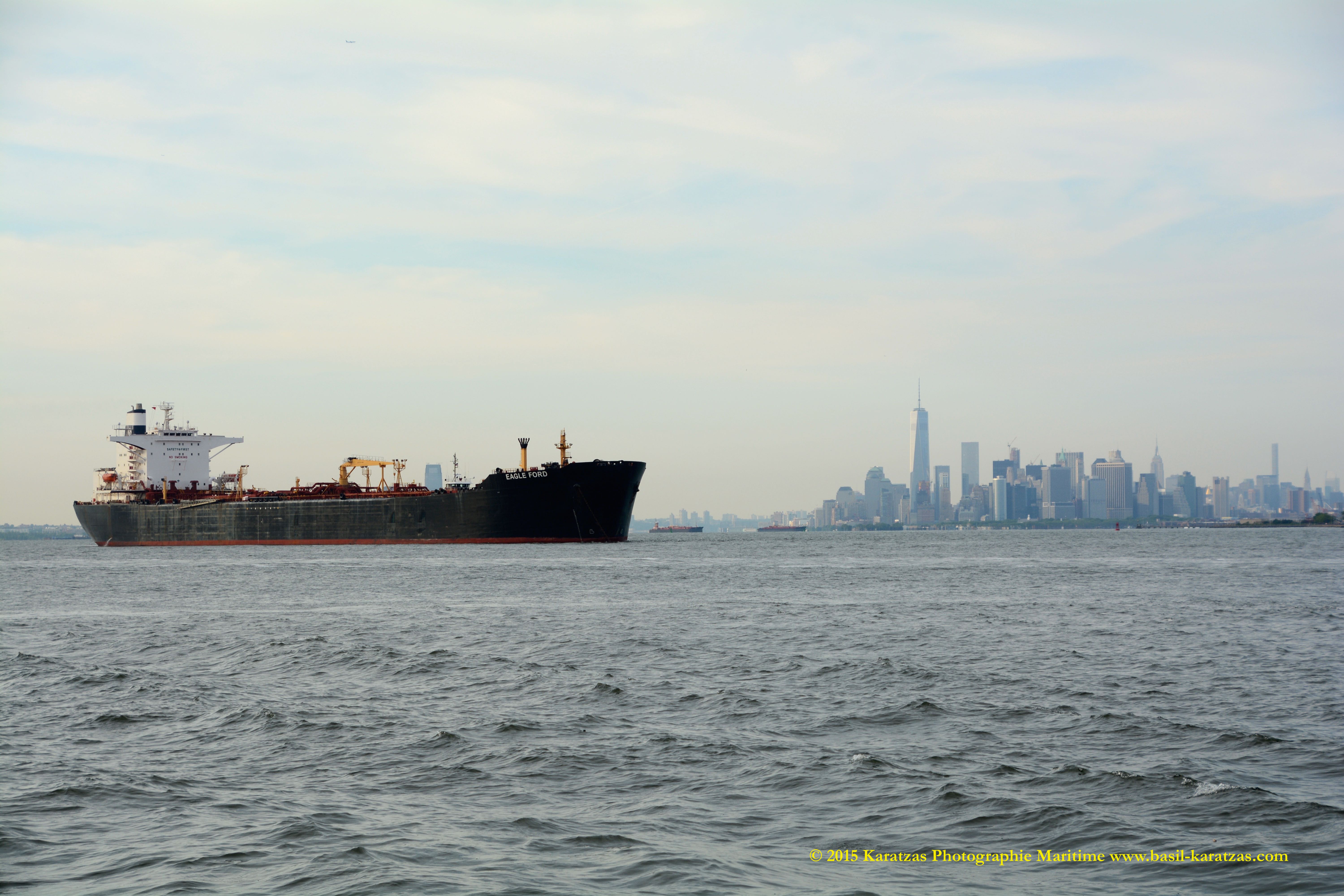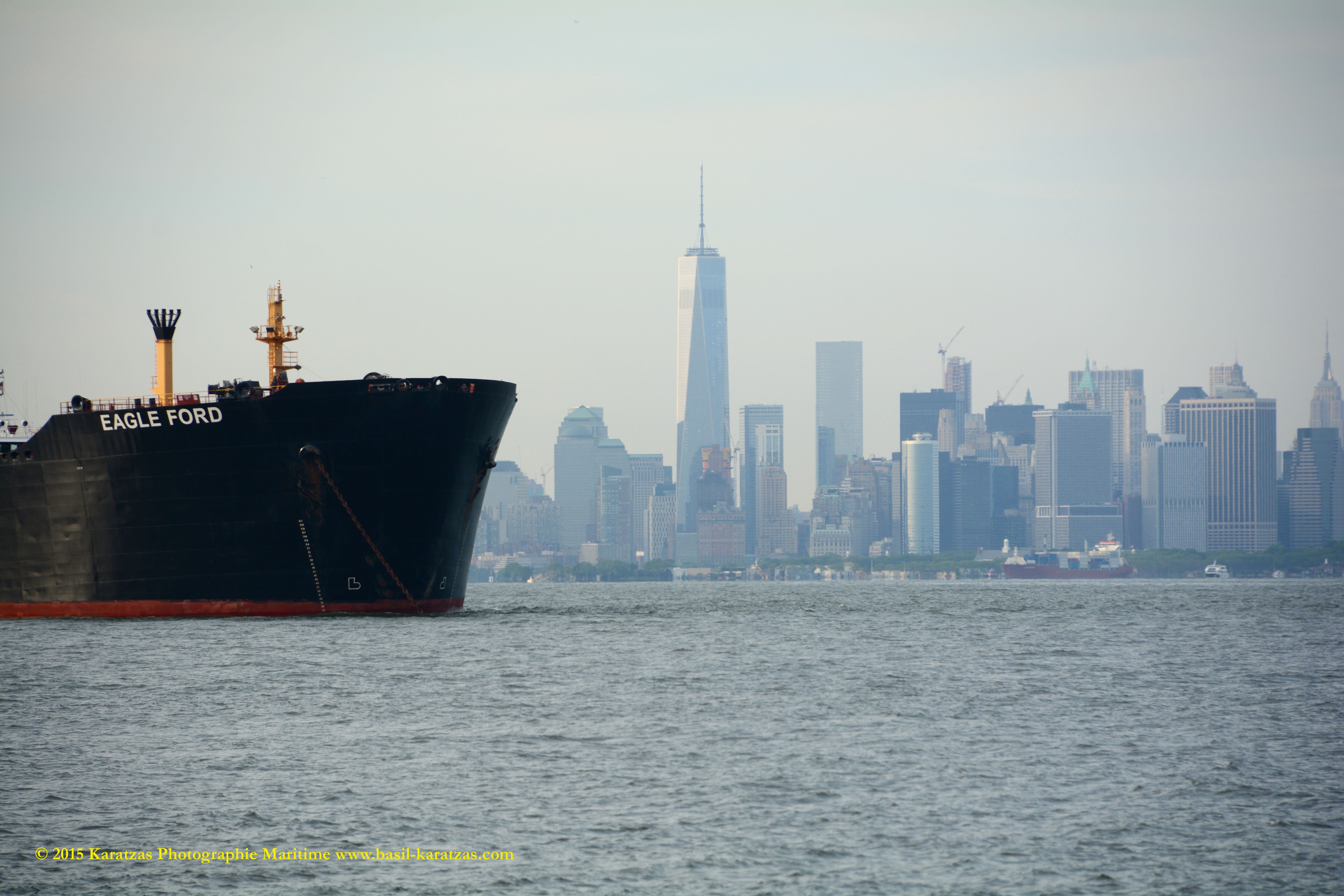 The rarest of all: ‘Eagle Ford’ suezmax tanker, built and flagged in the USA (Jones Act), with Downtown Manhattan skyline and the new World Trade Center in background. Image credit: Karatzas Images