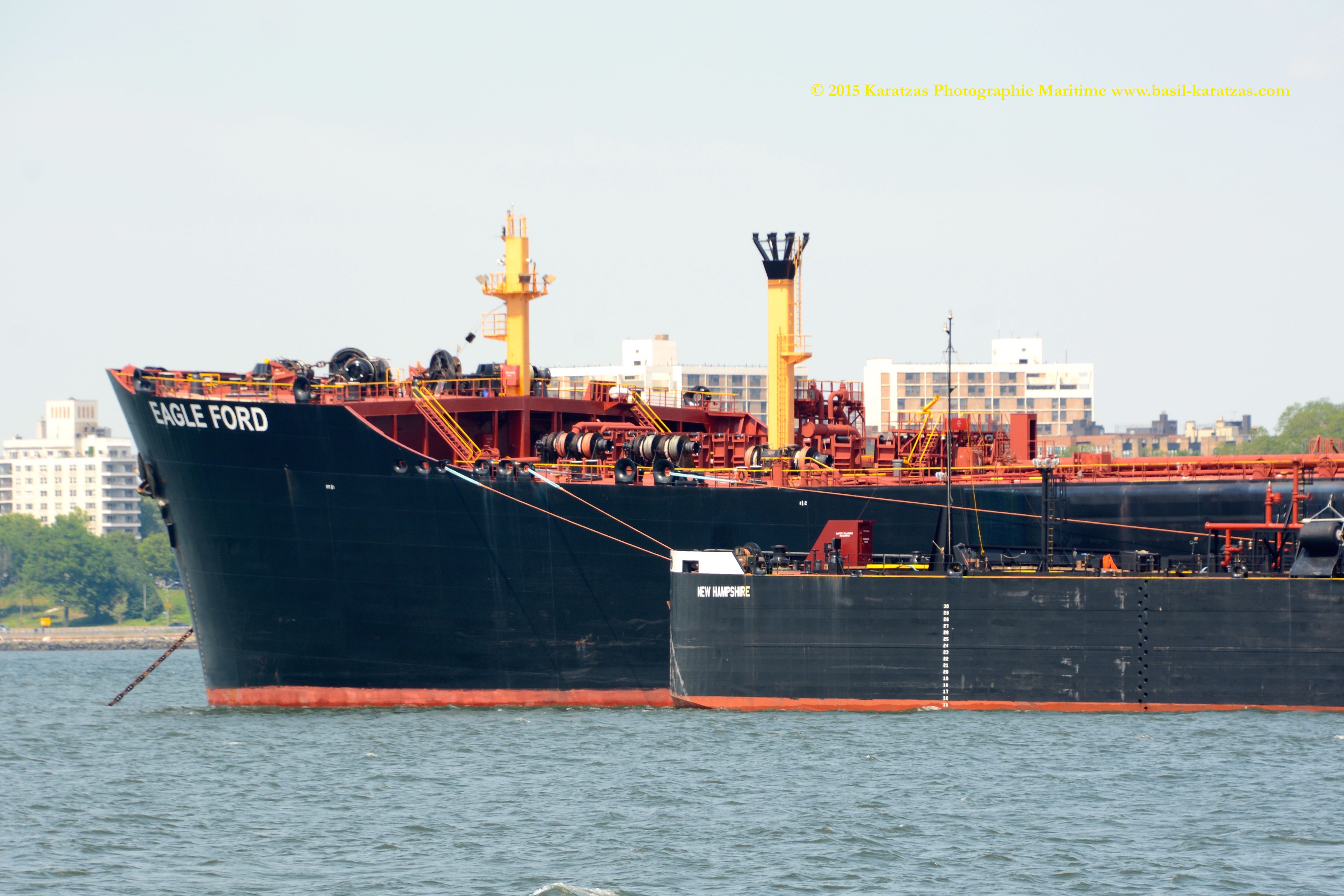 The rarest of all: ‘Eagle Ford’ Suezmax tanker, built and flagged in the USA (Jones Act), formerly owned by SeaRiver (ExxonMobil subsidiary), while lightering crude oil to ATB ‘New Hampshire’ under the shadow of the Verrazano-Narrows Bridge. Image credit: Karatzas Images