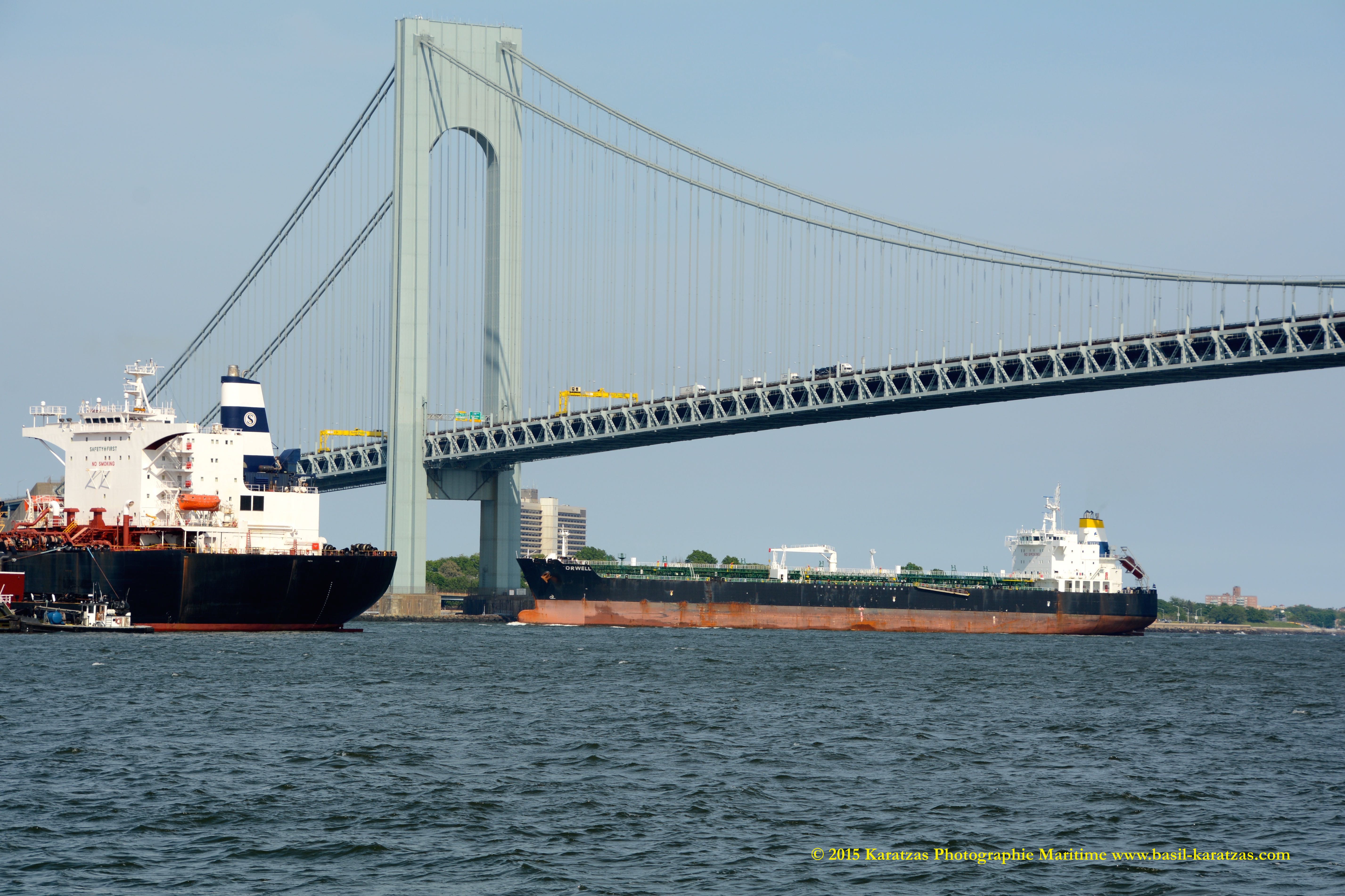 The rarest of all: ‘Eagle Ford’ Suezmax tanker under the shadow of the Verrazano-Narrows Bridge with inbound products tanker MT “Orwell”.  Image credit: Karatzas Images