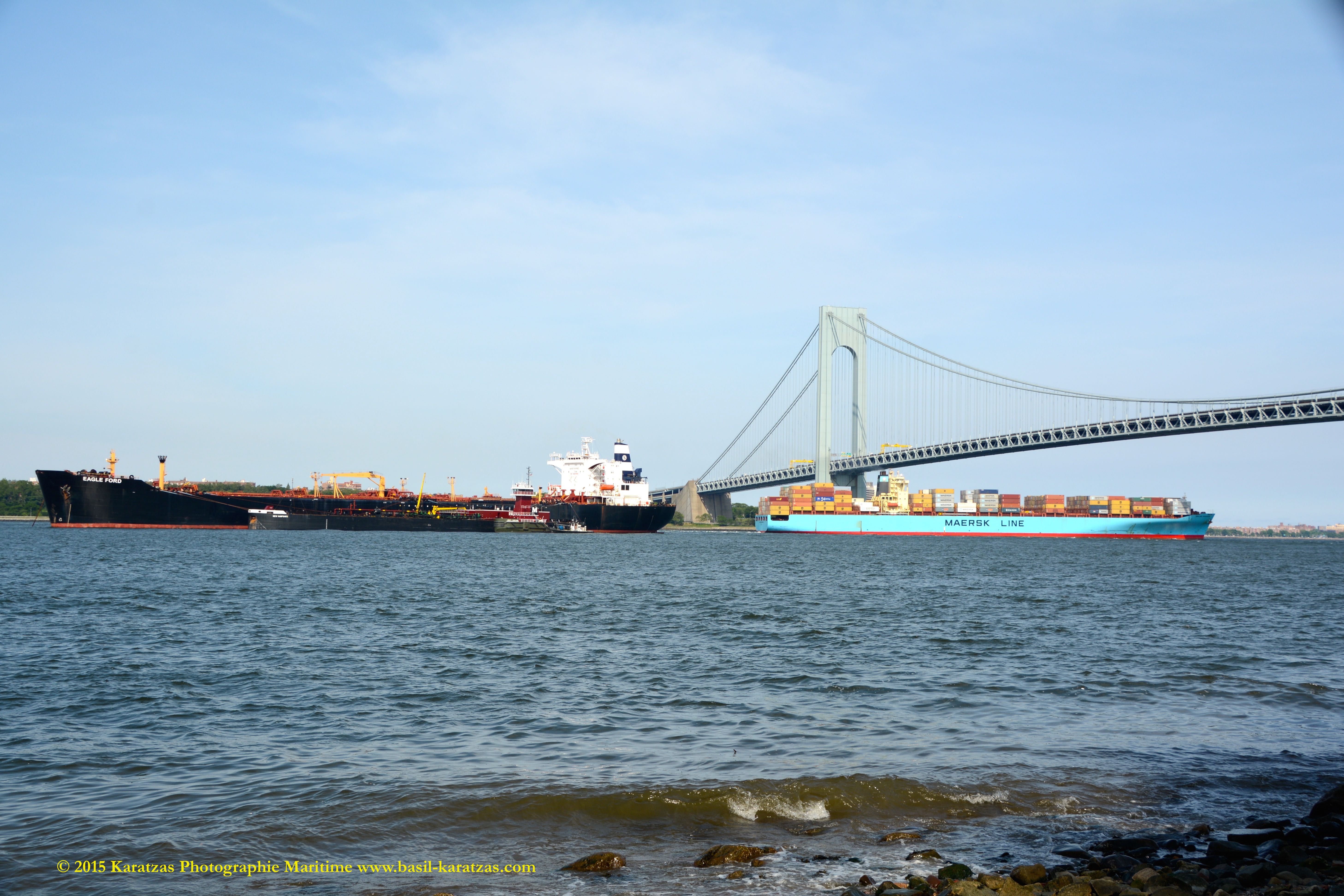 The rarest of all: Suezmax tanker ‘Eagle Ford’ under the shadow of the Verrazano-Narrows Bridge with containership MV “Sea-Land Washington” outbound. Image credit: Karatzas Images